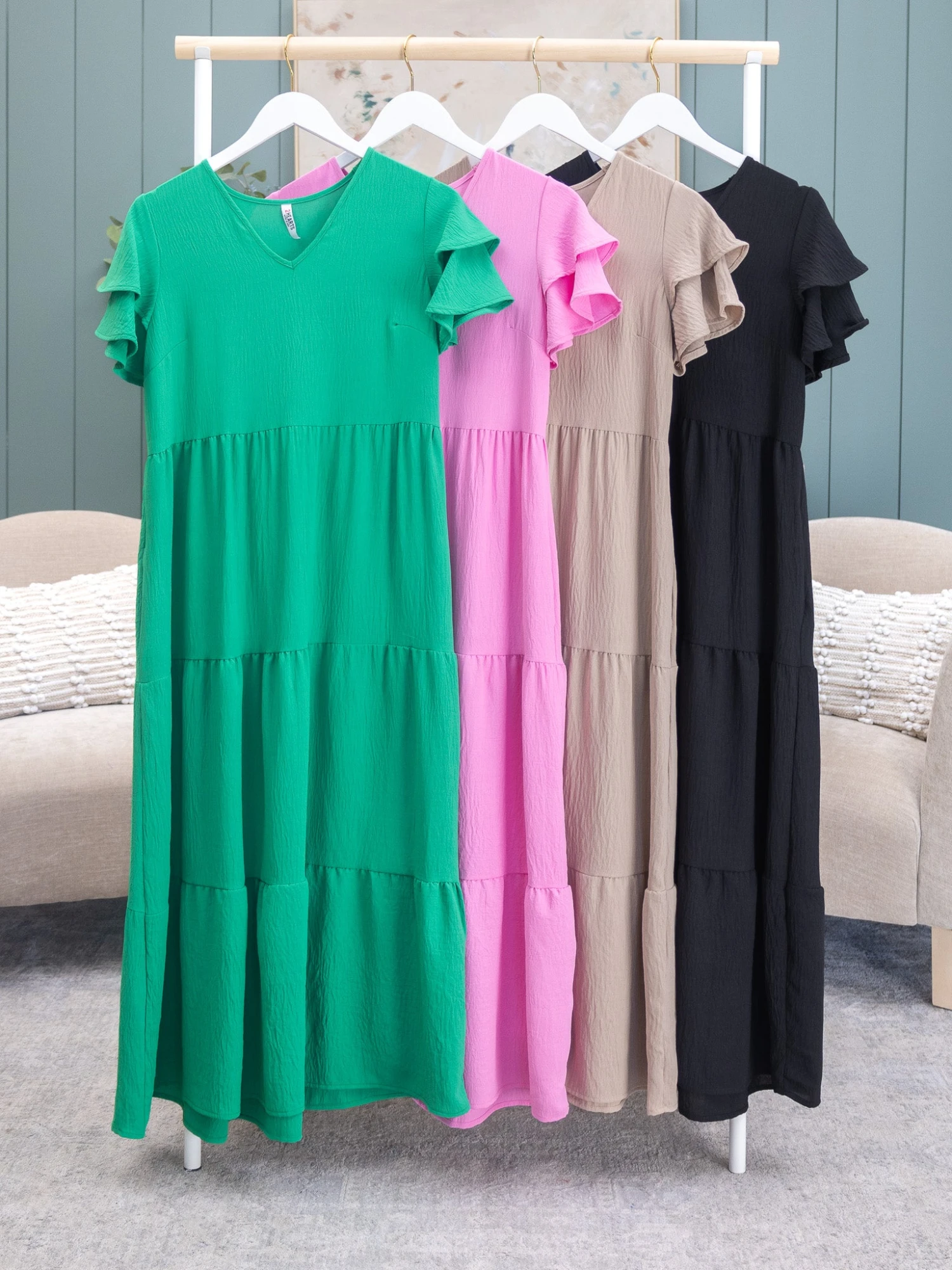 Features: V Neck, Tulip Short Sleeves, Pockets, Airflow Tiered Midi Dress