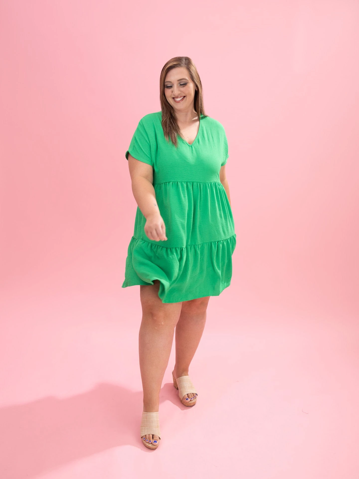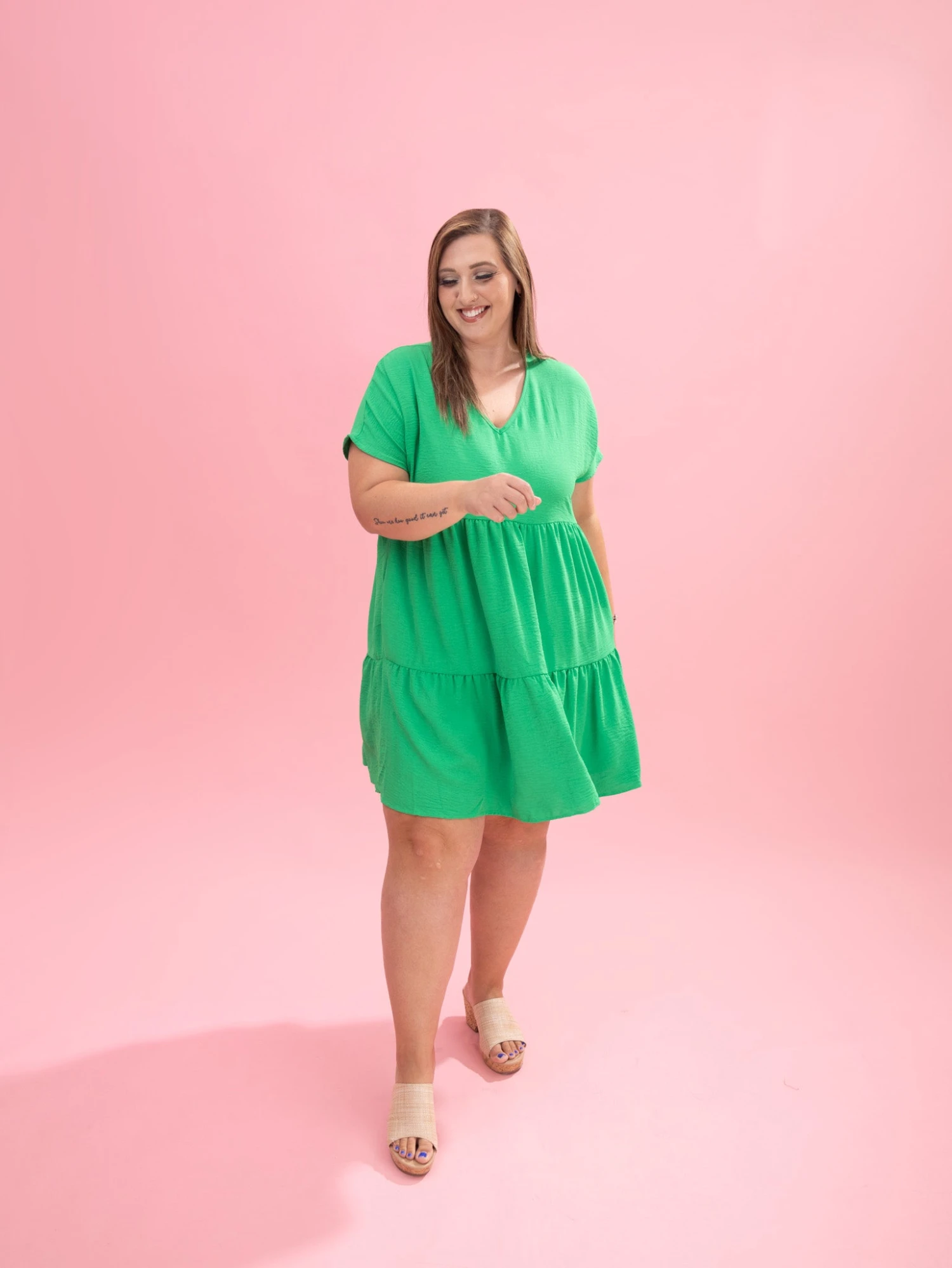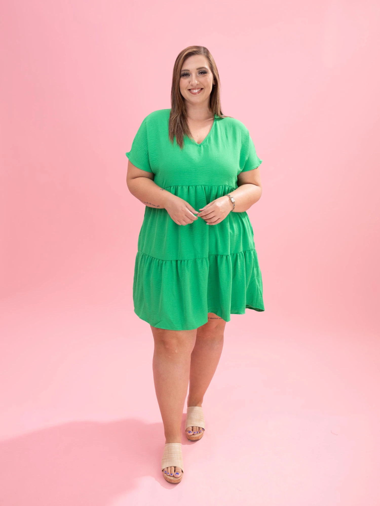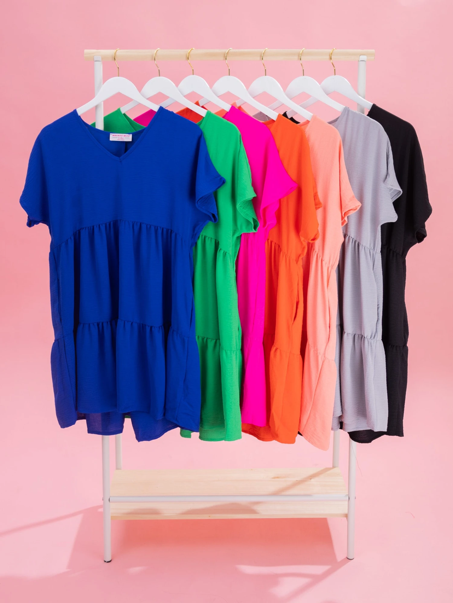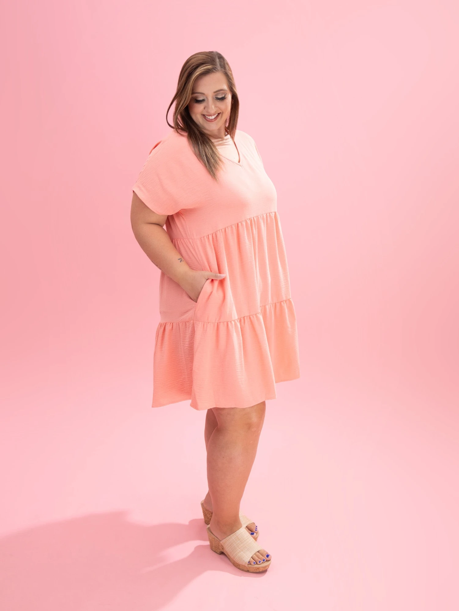 Features: V Neck, Short Sleeves, Pockets, Airflow, Tiered, Knee Length