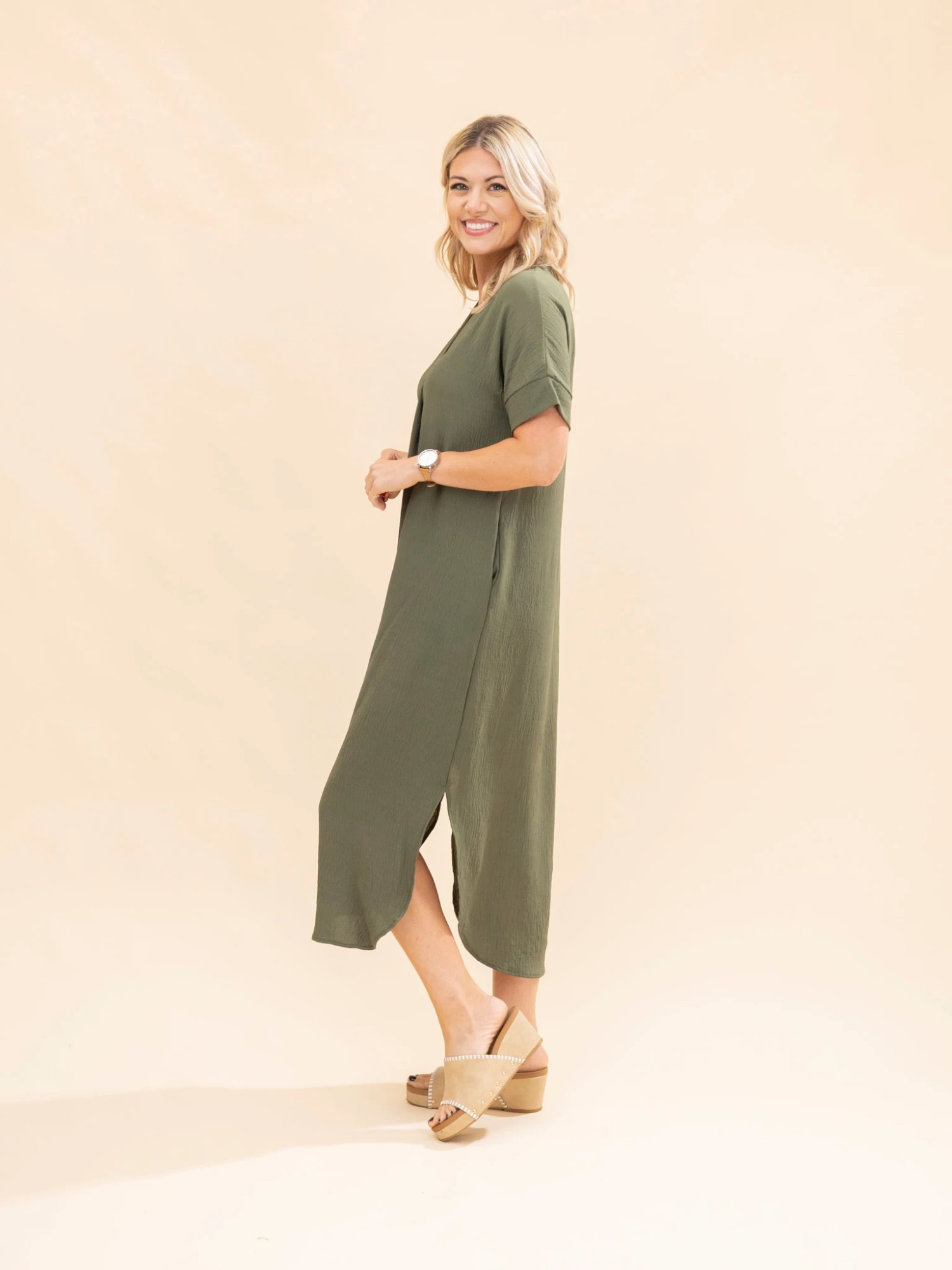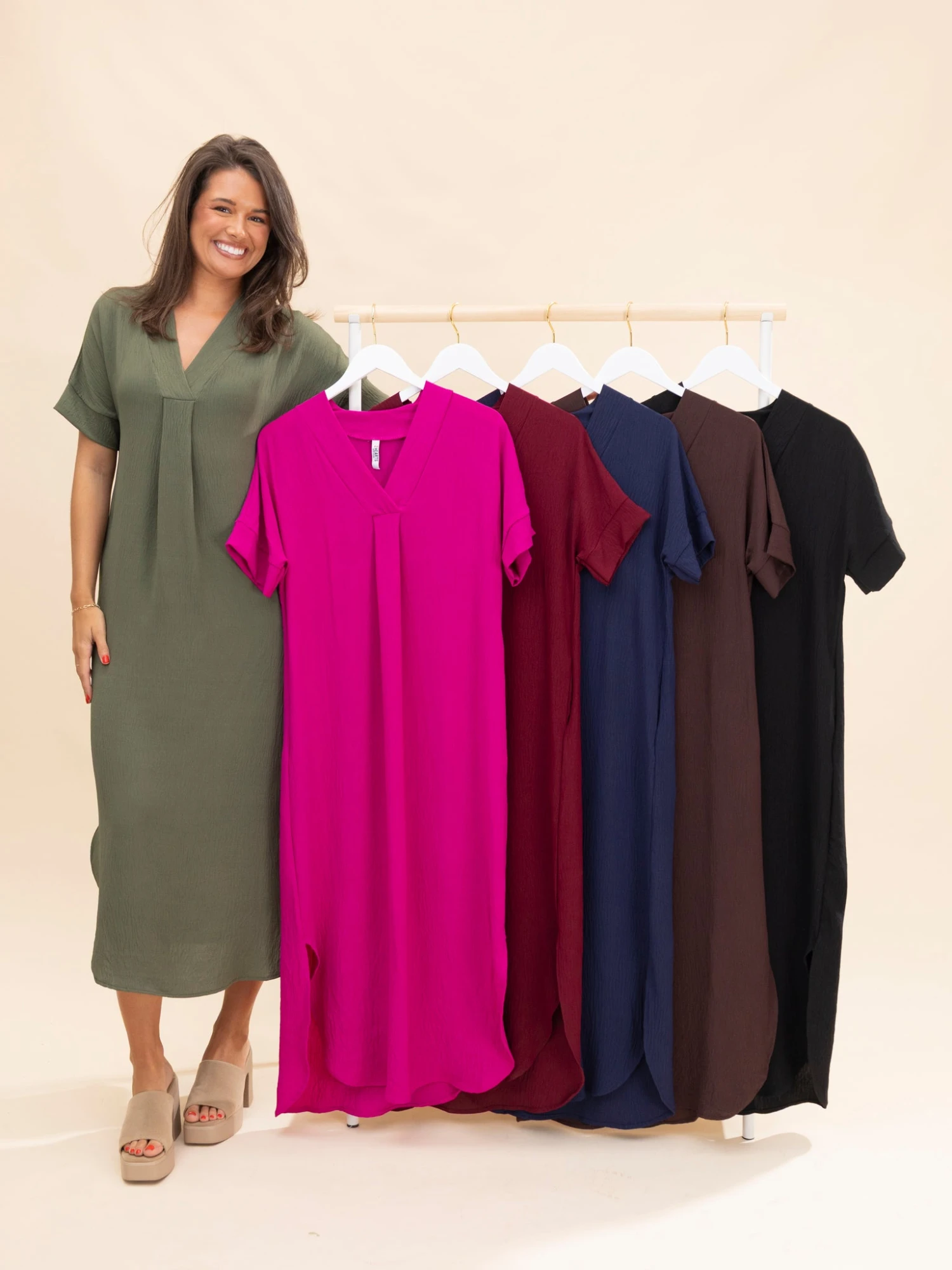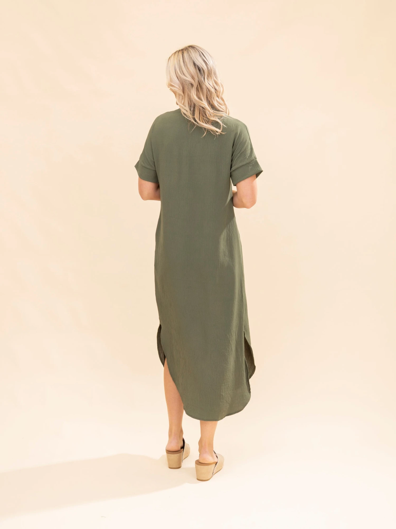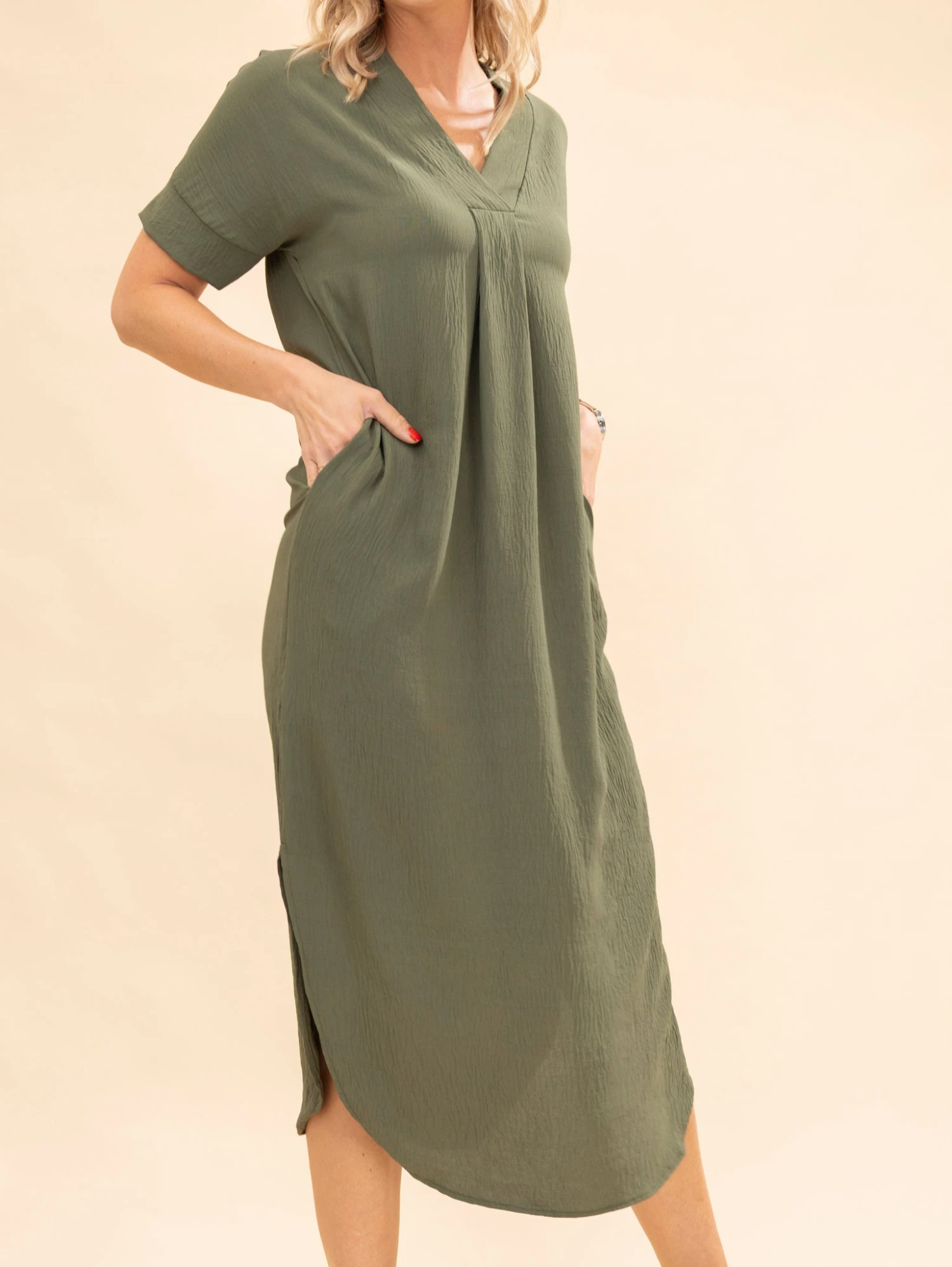 Features: V Neck With Pleat, Pockets, Side Slits, Curved Hem, Solid Airflow Maxi Dress