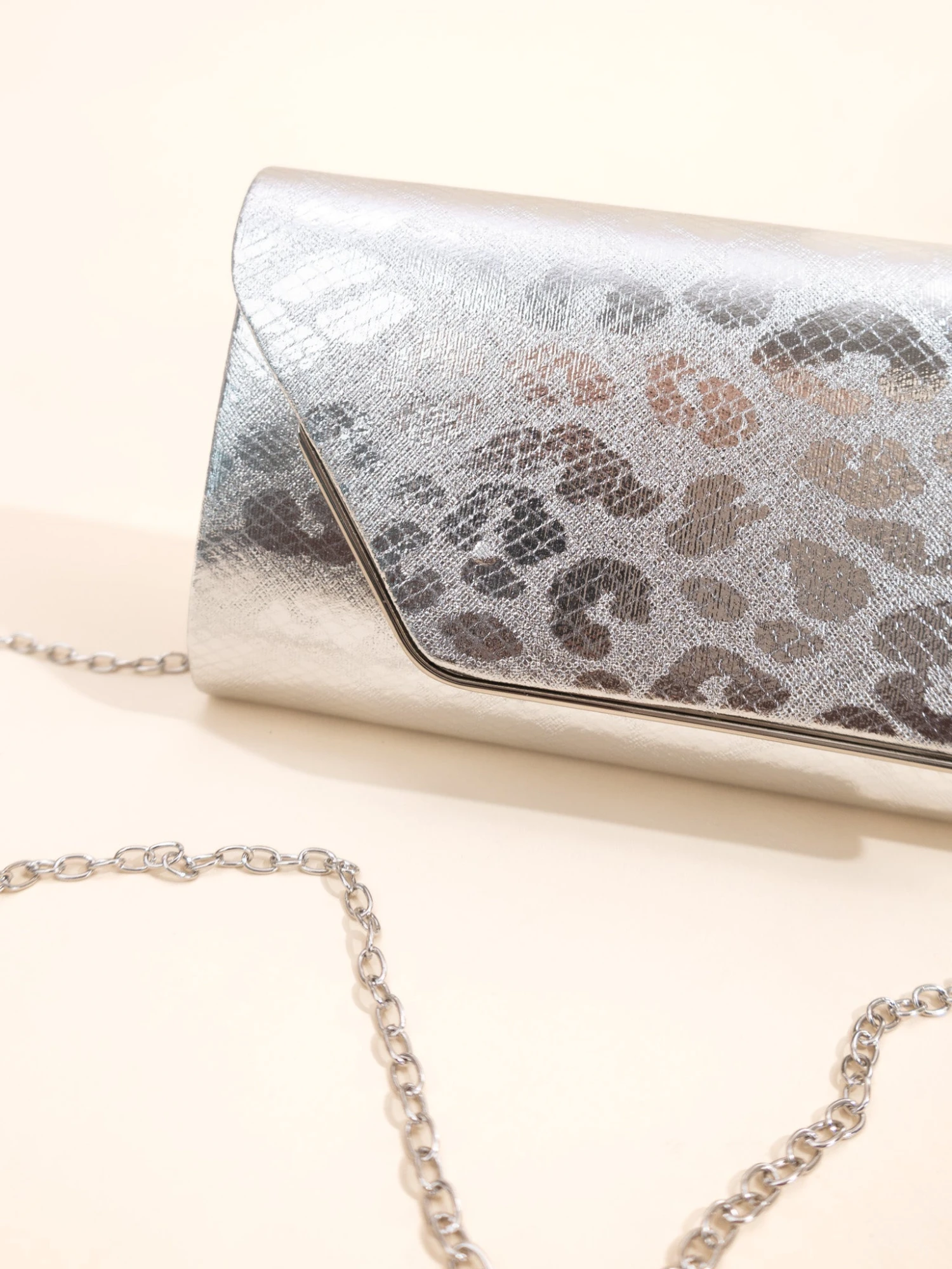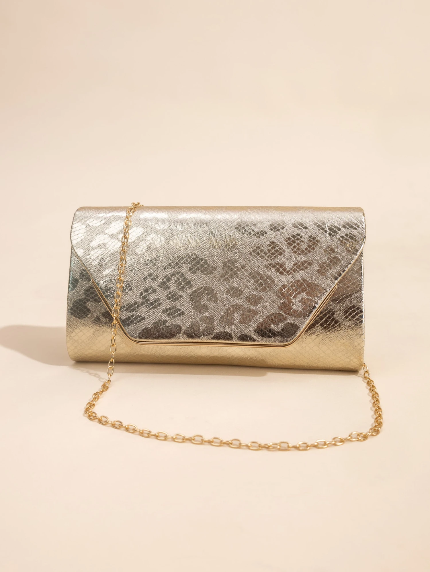 Features: Animal Printed Detail W/ Gold Accent, Attachable Gold Chain Strap, Button Closure, Envelope Clutch