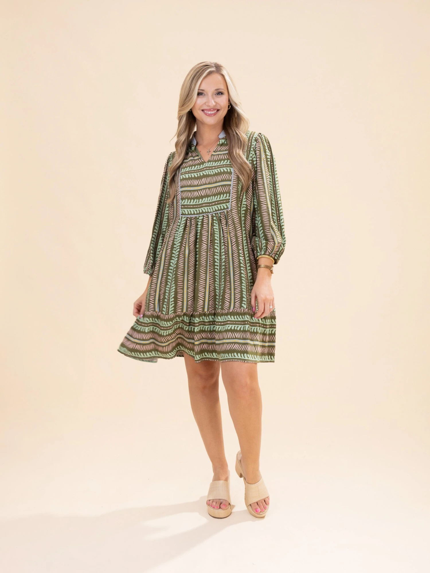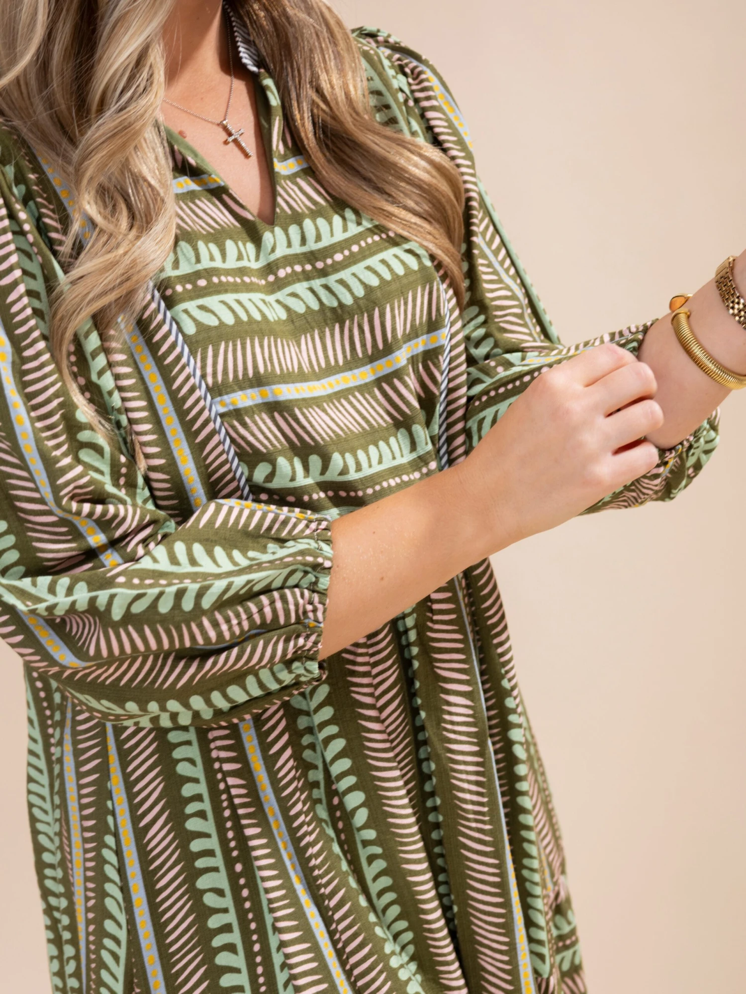 Features: V Neck, 3/4 Elastic Sleeves, Aztec Printed Babydoll Dress