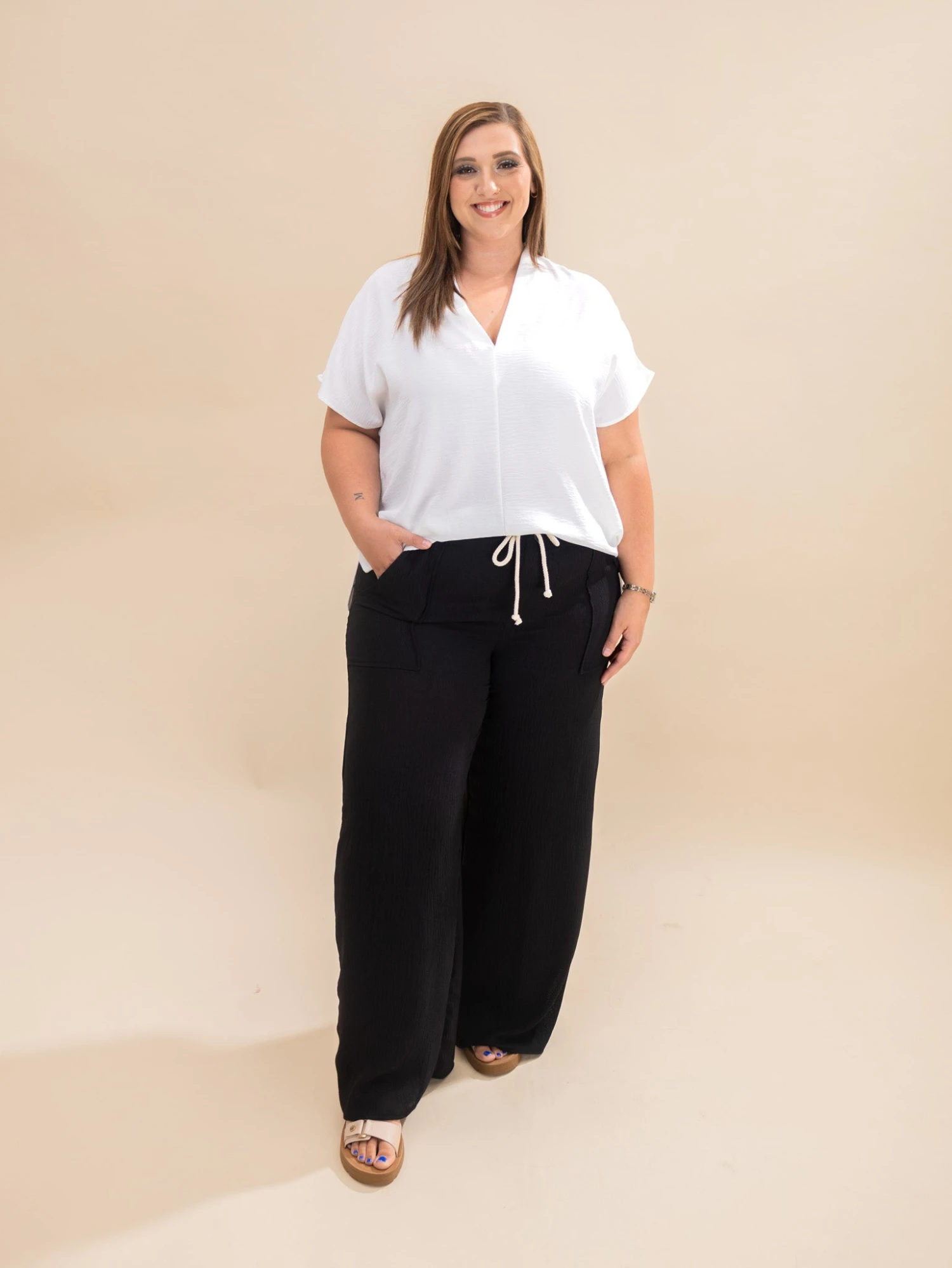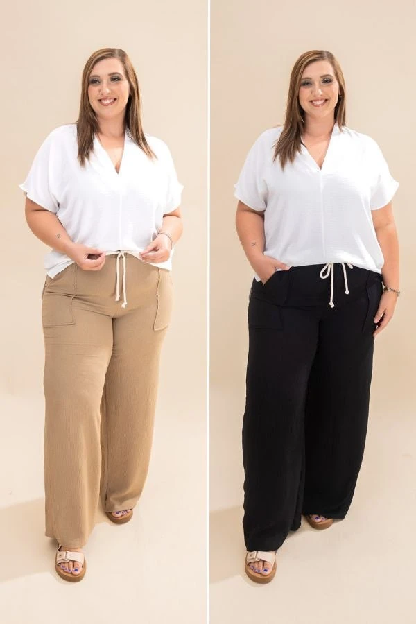 Features: Elastic Waist W/ Nonfunctional Drawstring, Pockets, Wide Leg Loose Fit Pants