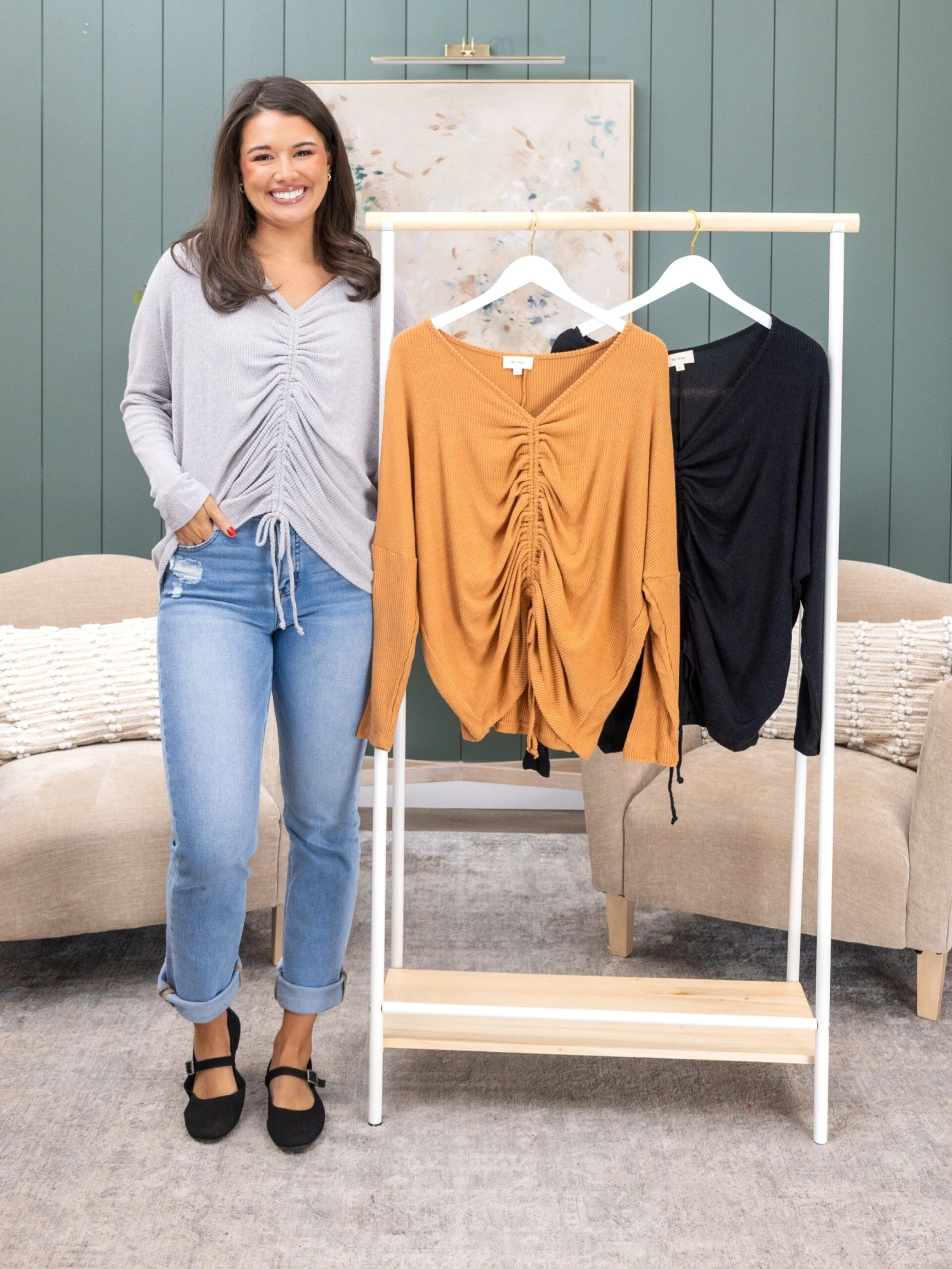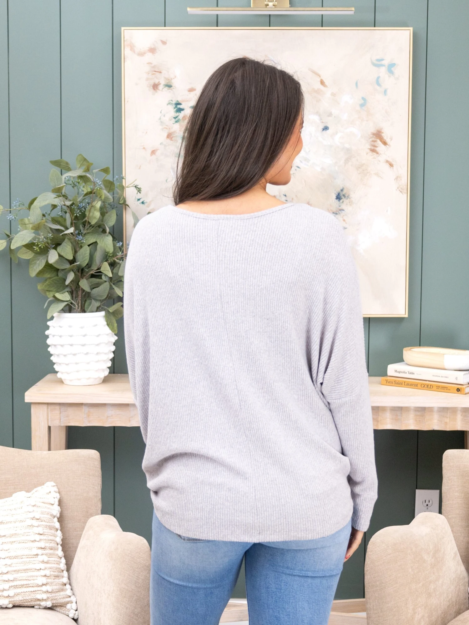 Erin is 5’8, 36C bra, typically wears size L/XL in tops and 14/15 in denim. Wearing size 1X. This fits oversized with stretch. If you are between sizes you can size down.