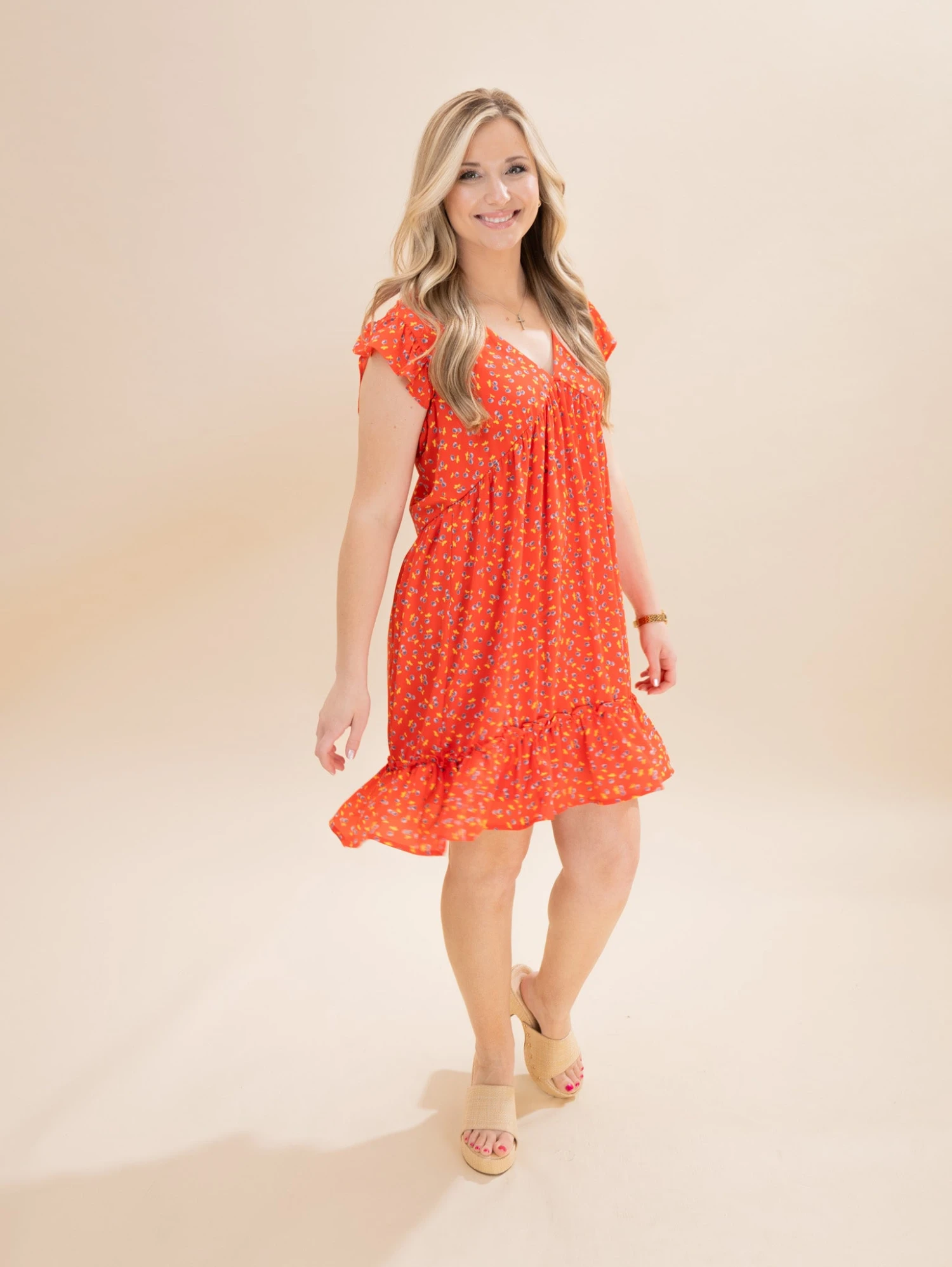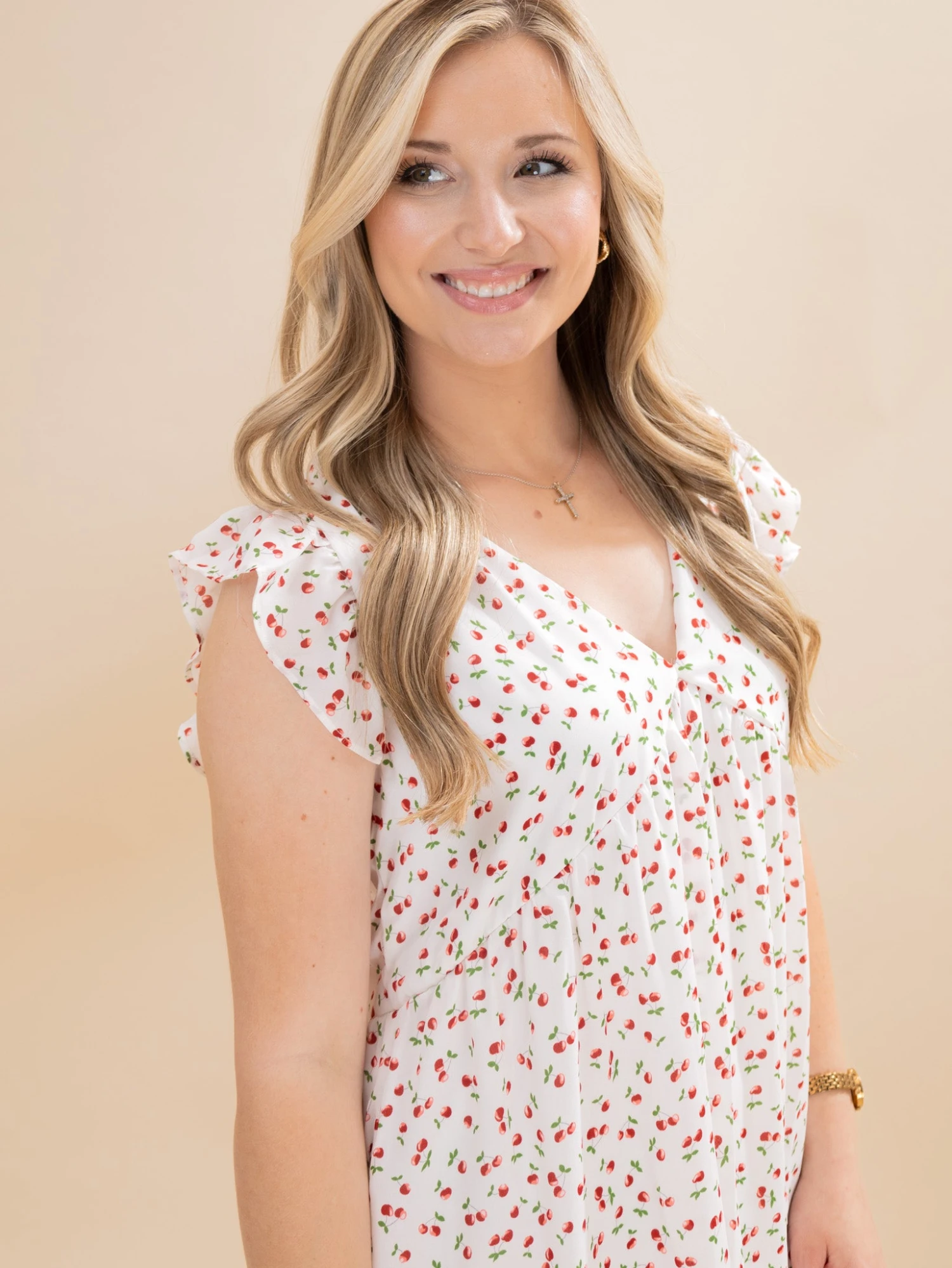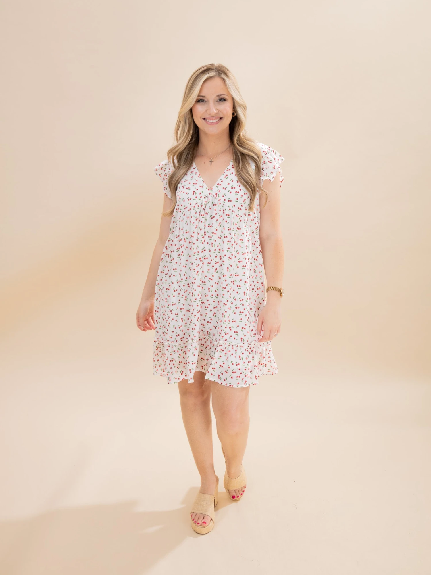 Features: Deep V Neck, Ruffle Short Sleeve, Button Keyhole Back, Ruffle Hem, Fully Lined Cherry Print Short Dress