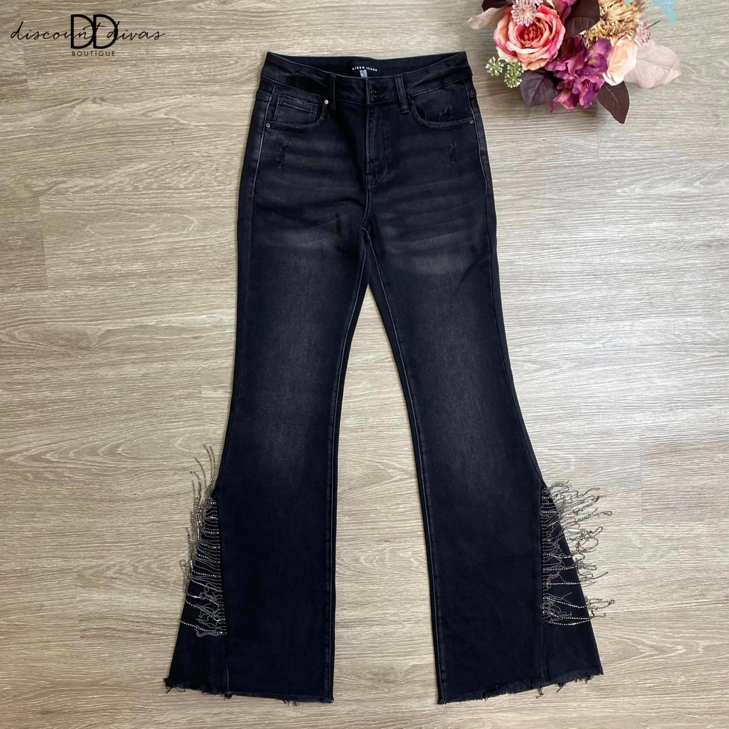 Features: black wash, mid rise, rhinestone detail, wide flare leg