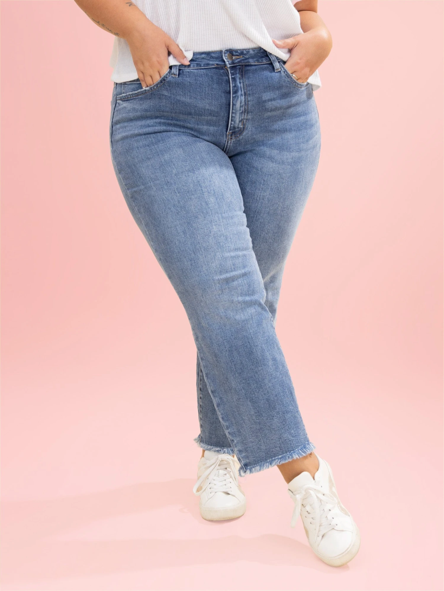 Features: Button/Zipper Waist, High Rise, Frayed Hem, Cropped Straight Jean