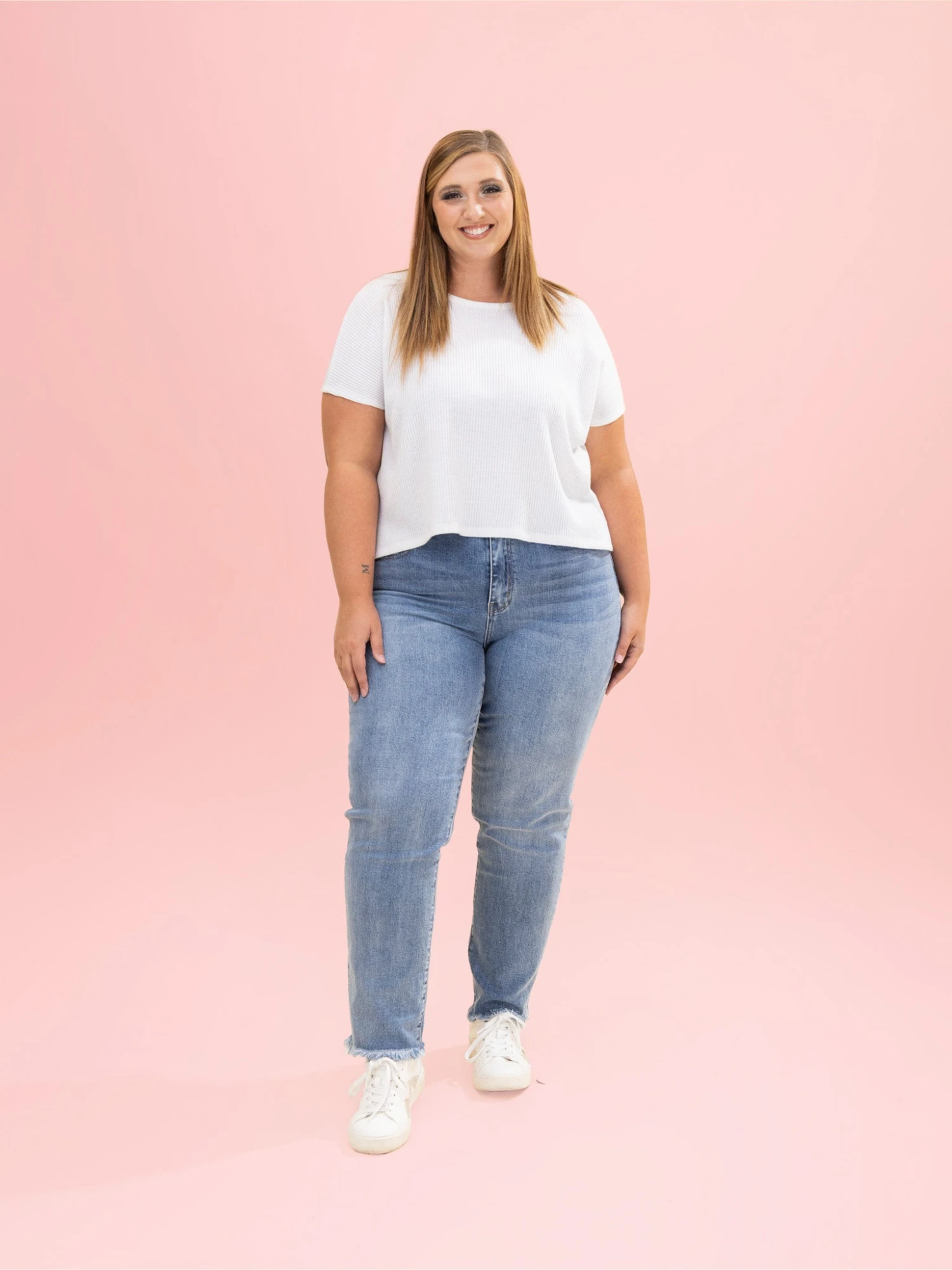Brittany (short blonde hair) is 5’10, 36B bra, typically wears size S in tops and 3 in denim. Wearing size 3 (29 inch inseam)