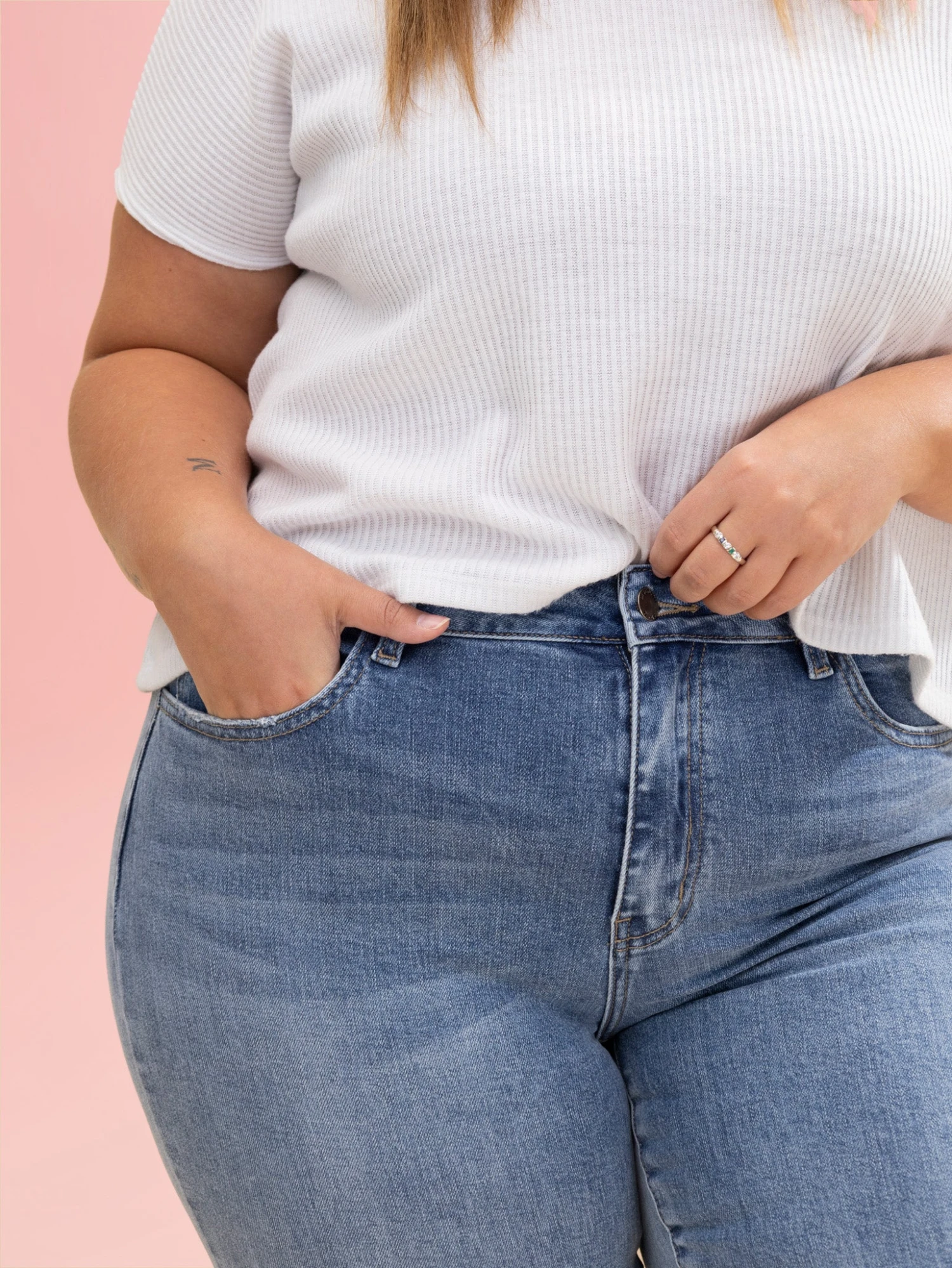 Erin is 5’8, 36C bra, typically wears size L/XL in tops and 14/15 in denim. Wearing size 14