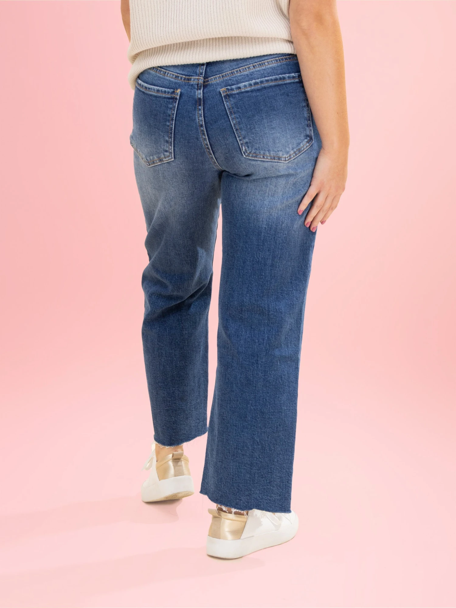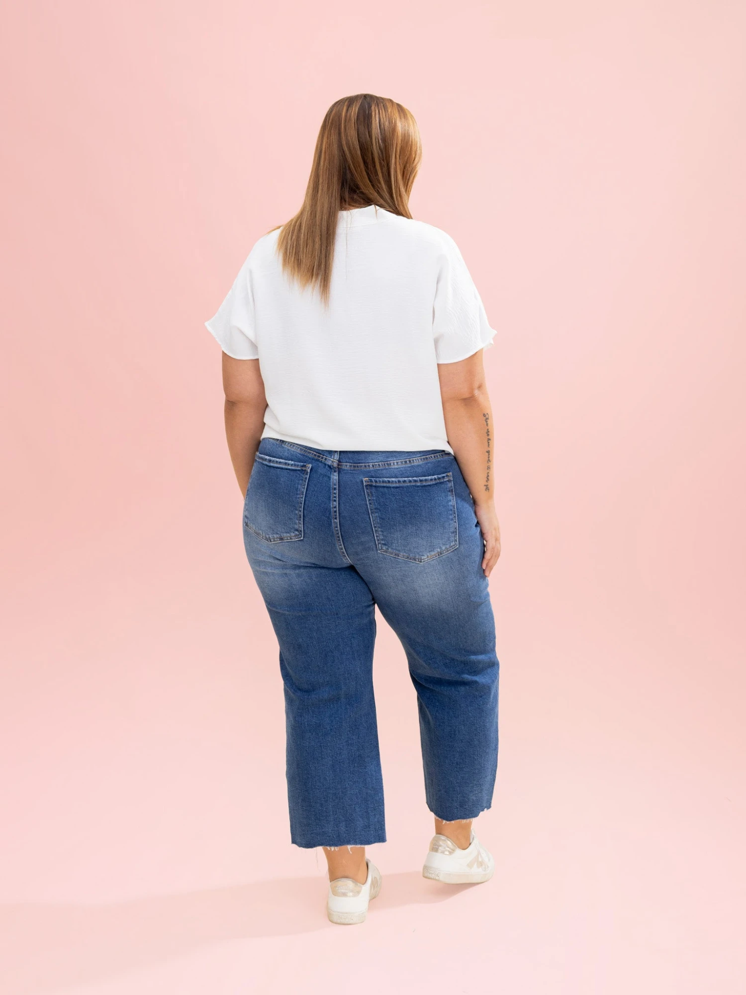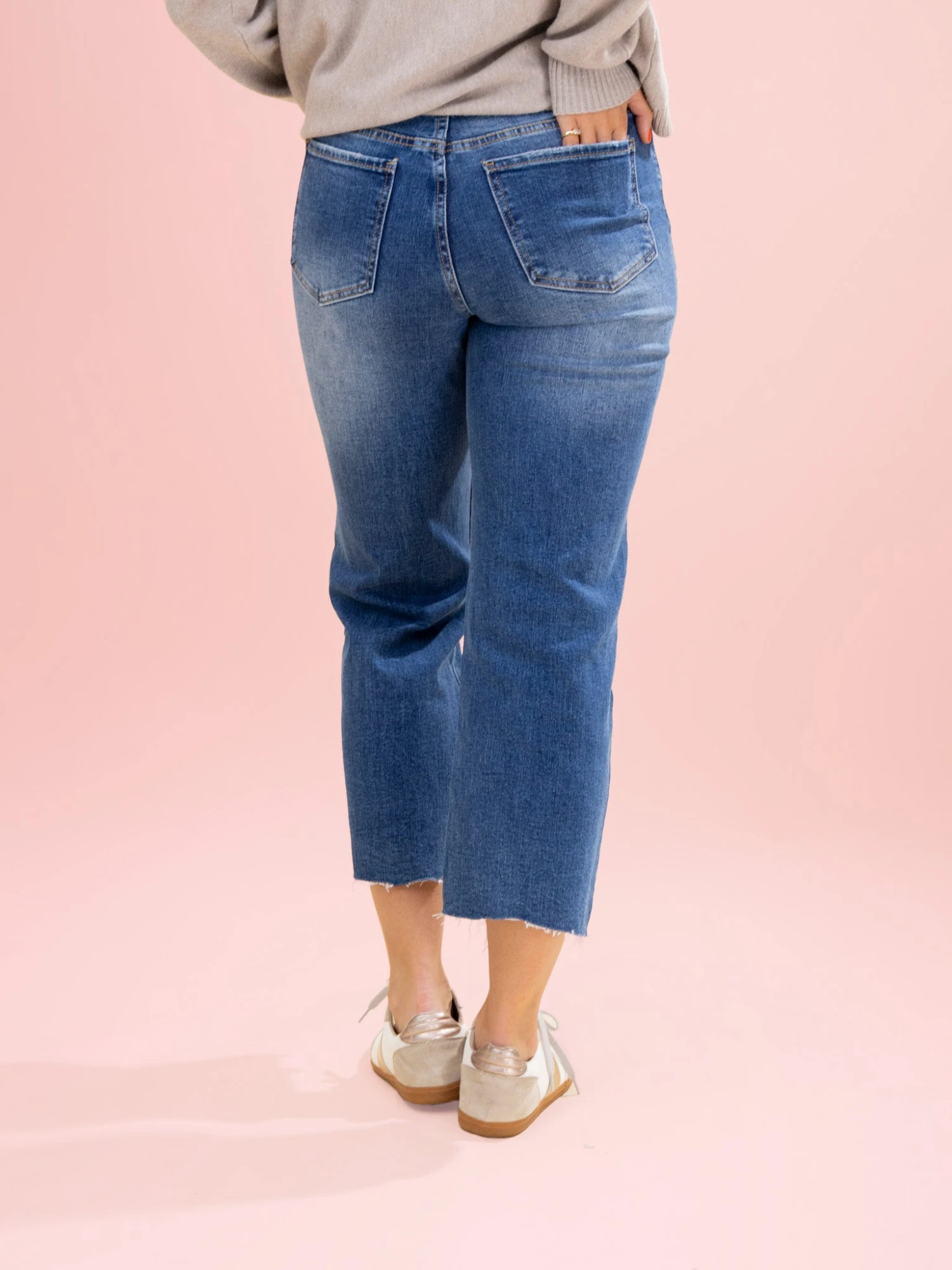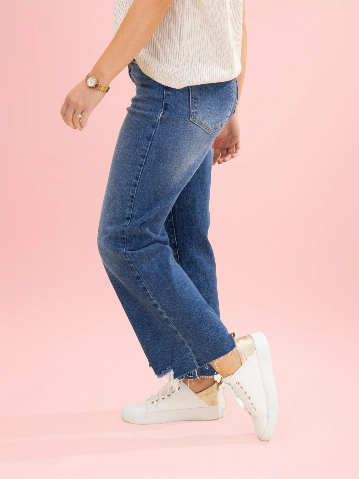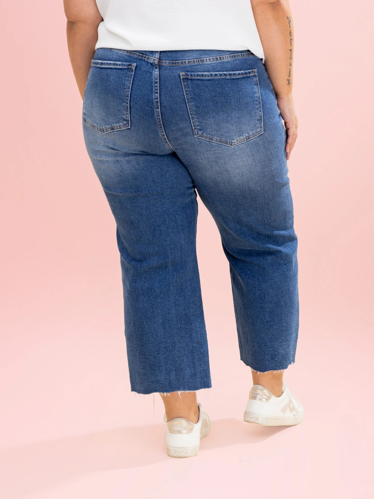 Features: Exposed Button Fly, High Rise, Destroyed Frayed Hem, Cropped Wide Leg