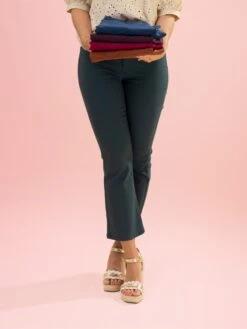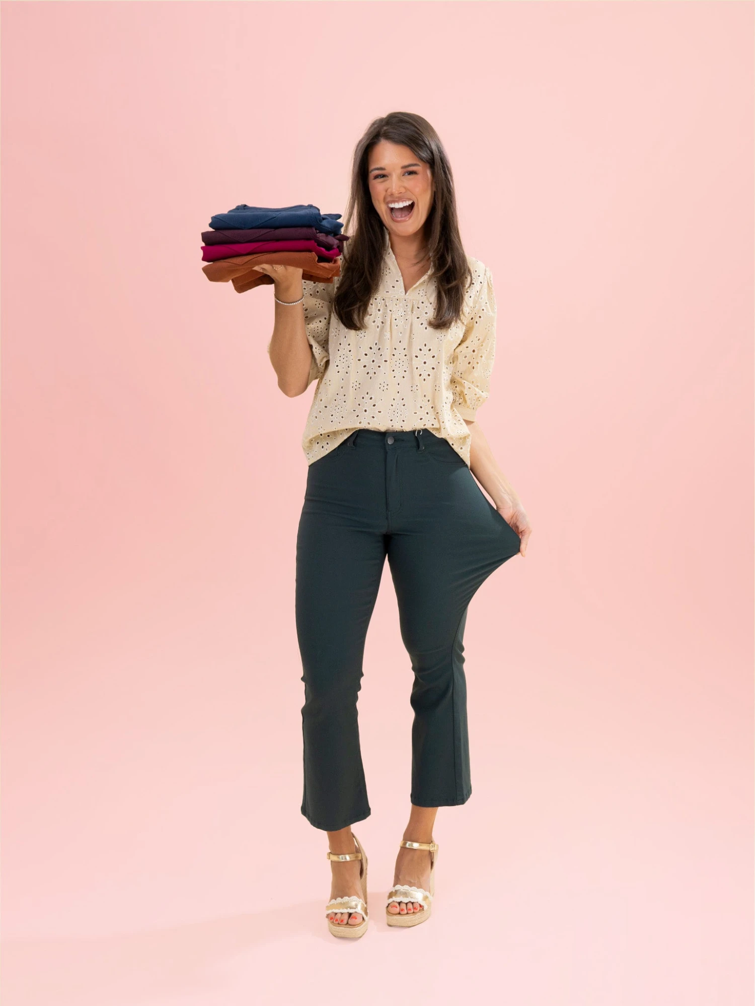 Maddy is 5’10 (short brown hair) wears a small bottom and 3/5 in denim. Maddy is wearing the Small.