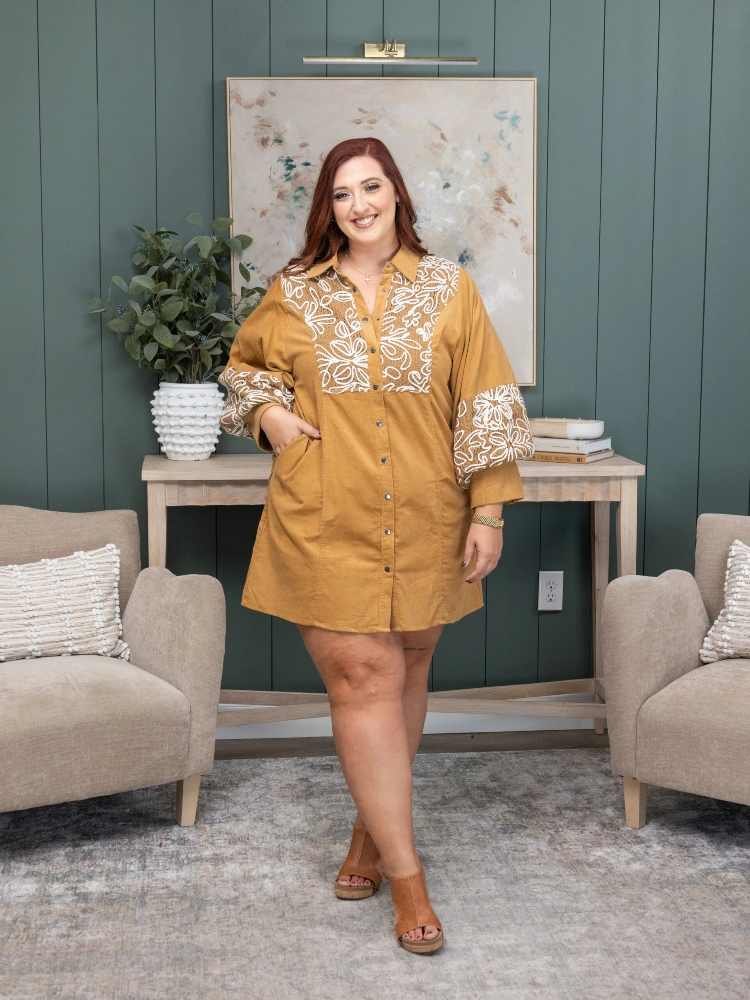 Features: Embroidered, Button-Up, Collared Neck, Puff Sleeves, Dress with Pockets
