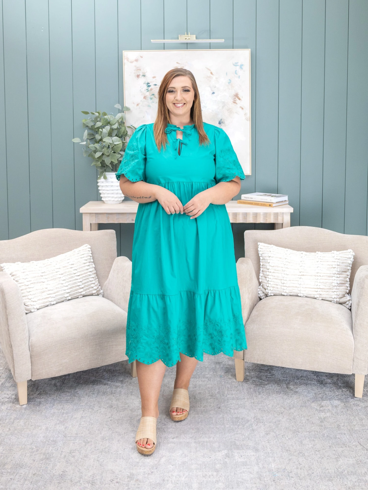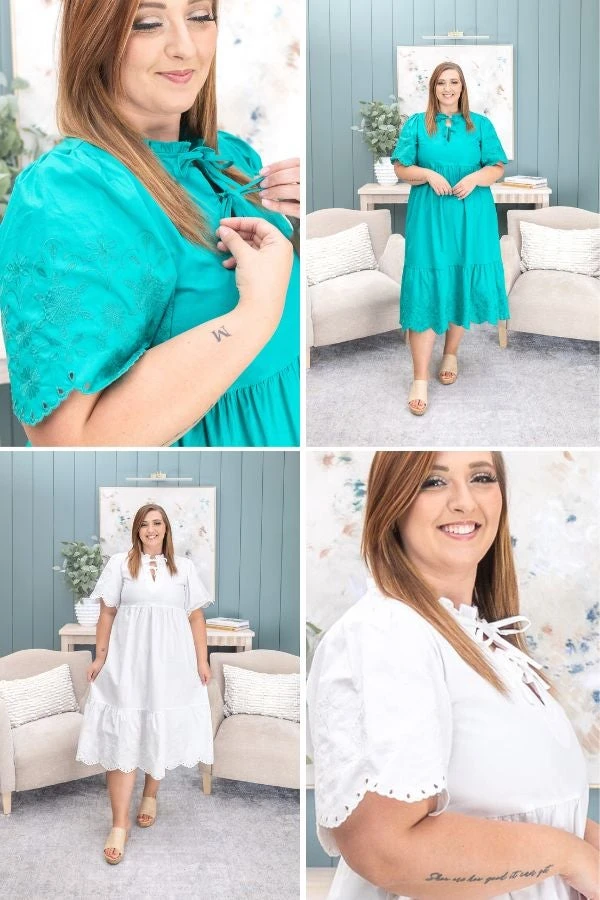 Features: Embroidered, Scallop, Tied Split Neck, Midi, Short Sleeve