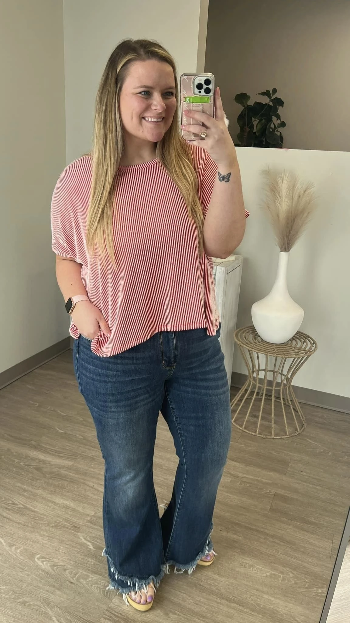 Samantha is wearing a 16 and she said they can go with Judy Blue high rise size, (her’s is normally a 14)!