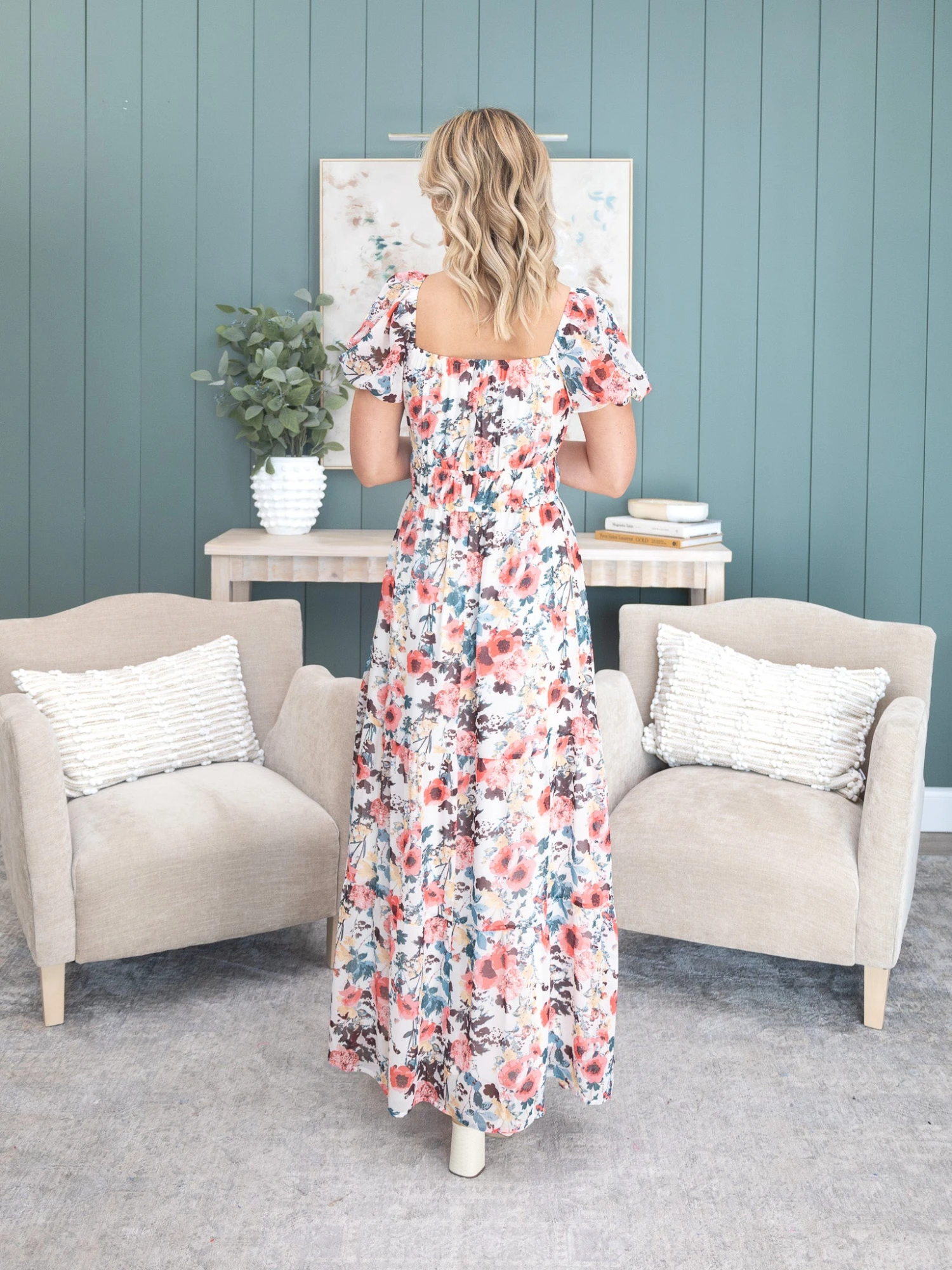 Features: Square Neck, Short Sleeves, Elastic Waist, Fully Lined, Floral Print, Chiffon Maxi