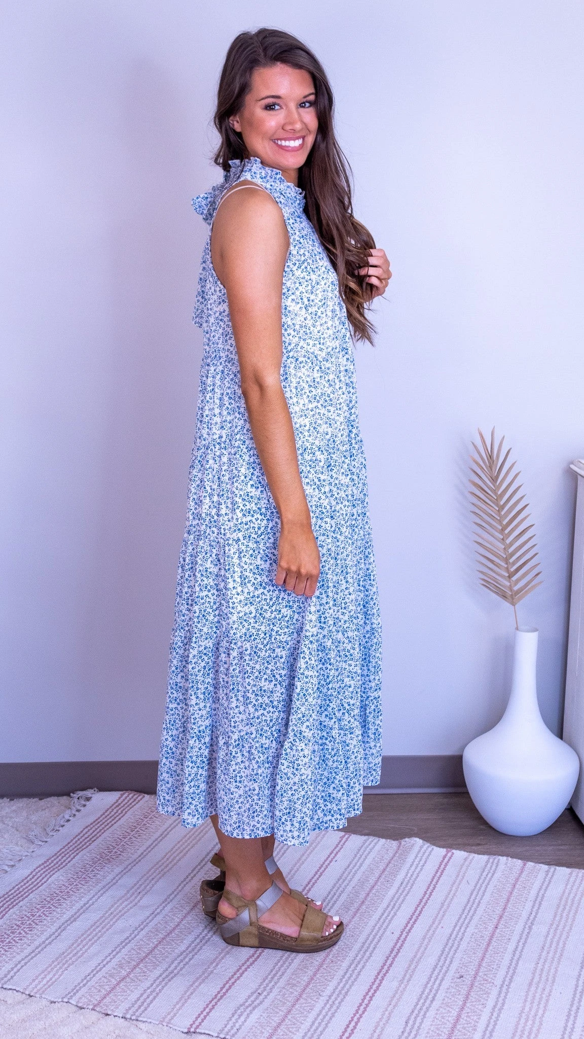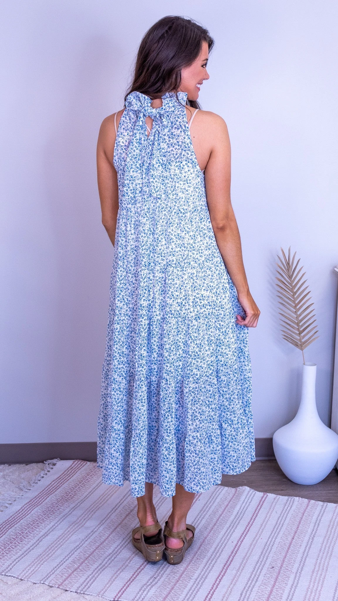 Features: round neck, sleeveless, back tie detail, tiered hem, lined