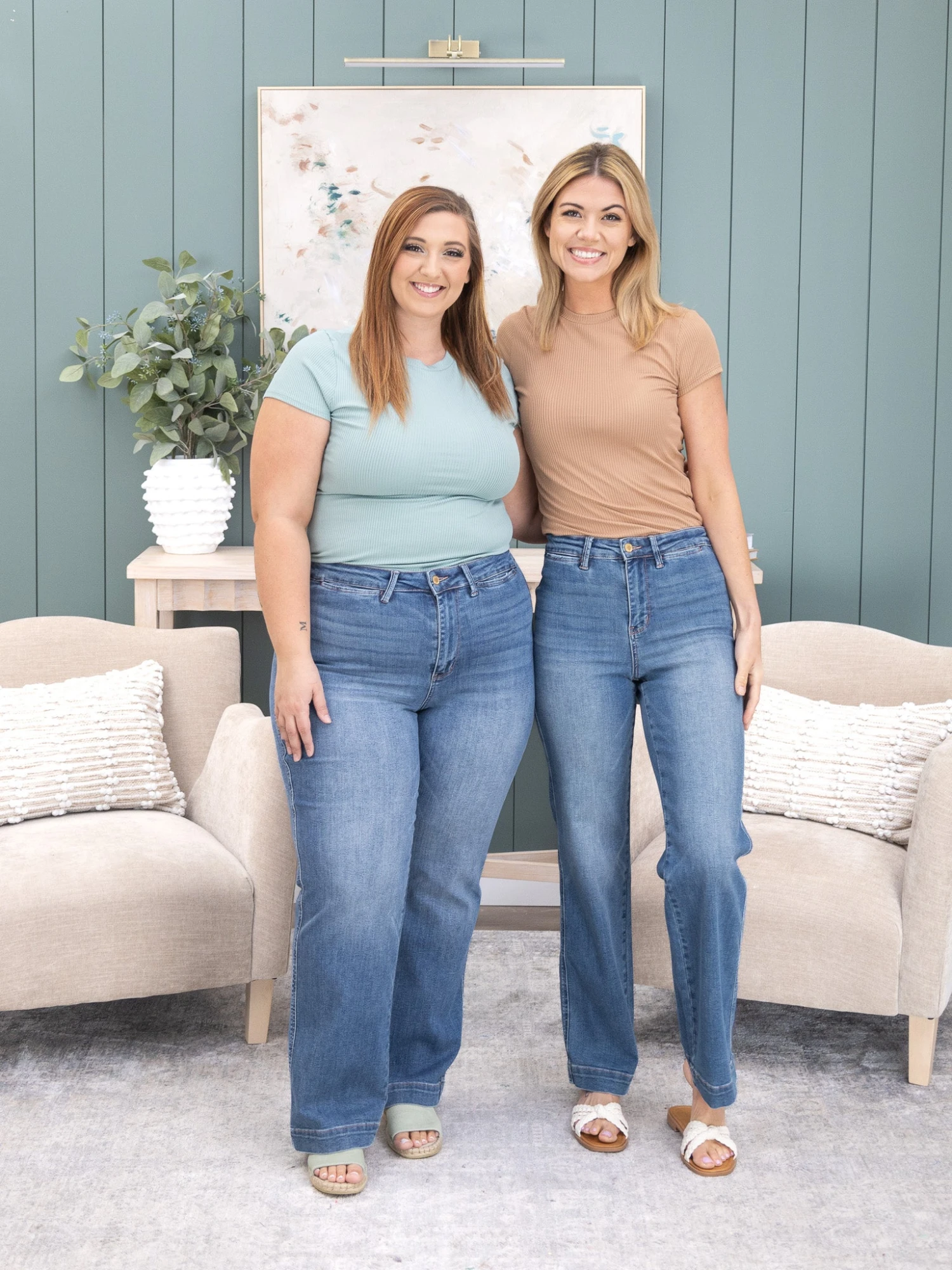 Brittany (short blonde hair) is 5’10, 36B bra, typically wears size S in tops and 3 in denim. Wearing size 3