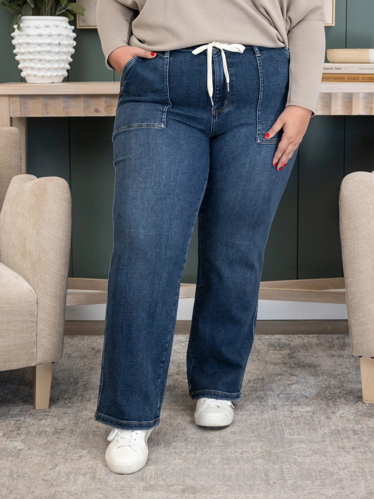 Features: High Waist, Drawstring, Wide Leg, Jeans