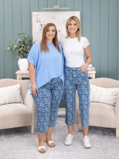 Features: High Waist, 5 Pocket, Flower Print, Raw Hem, Cropped Wide Leg