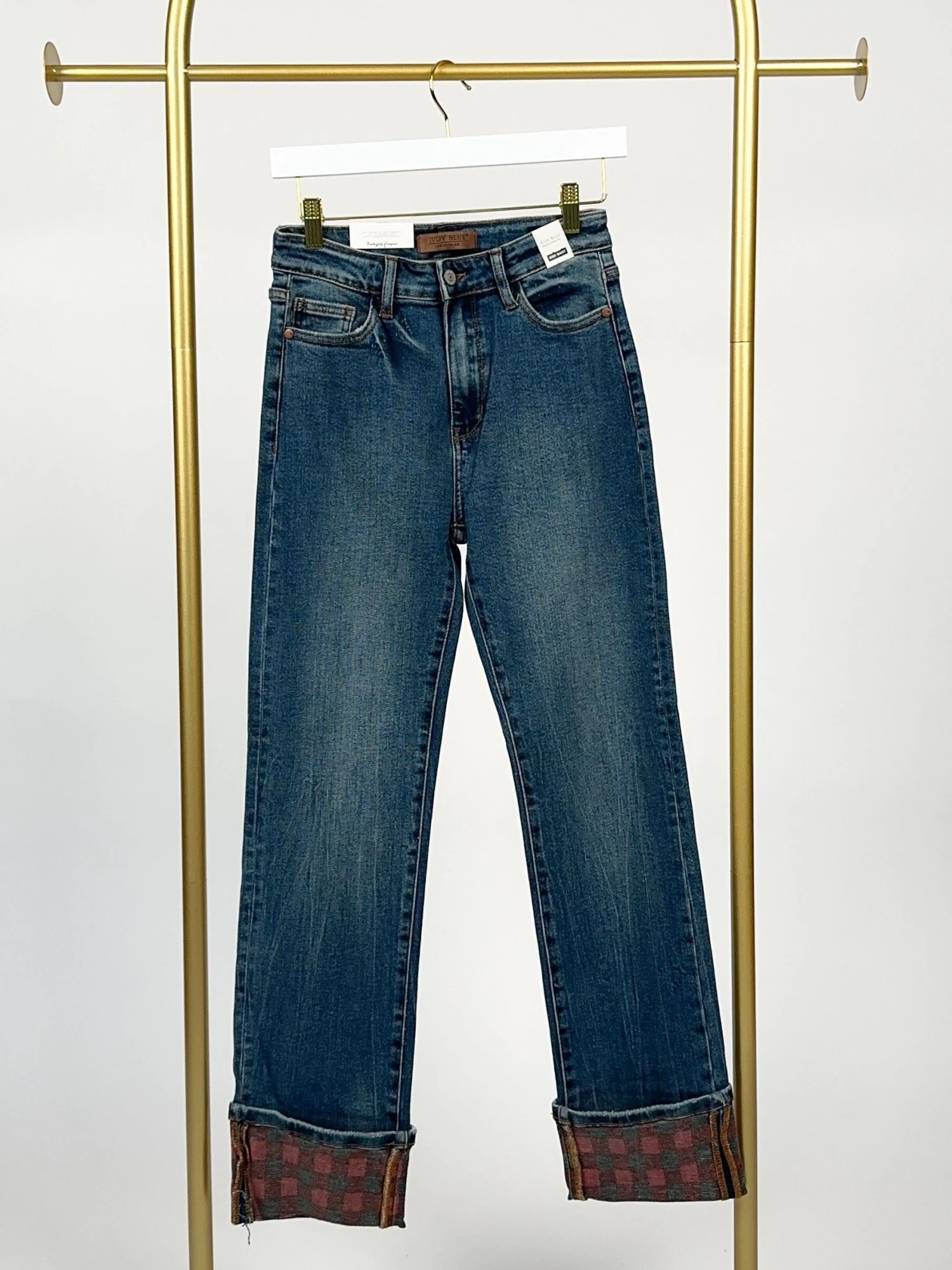 Features: Medium Wash, High Waist, Straight Leg, Plaid Cuffs