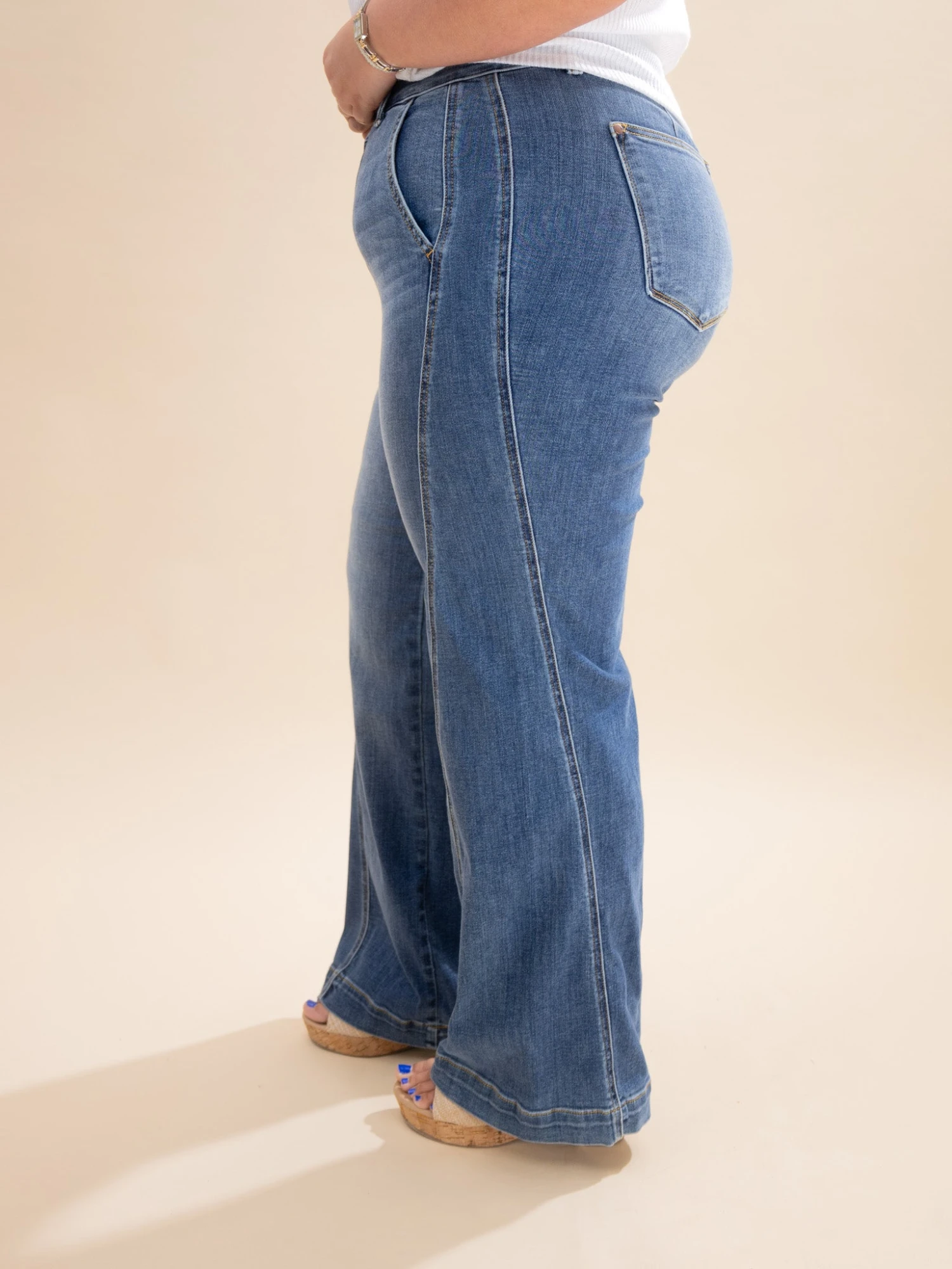 Features: Button/Zipper Waist, High Waist, Wide Leg Trouser Jean