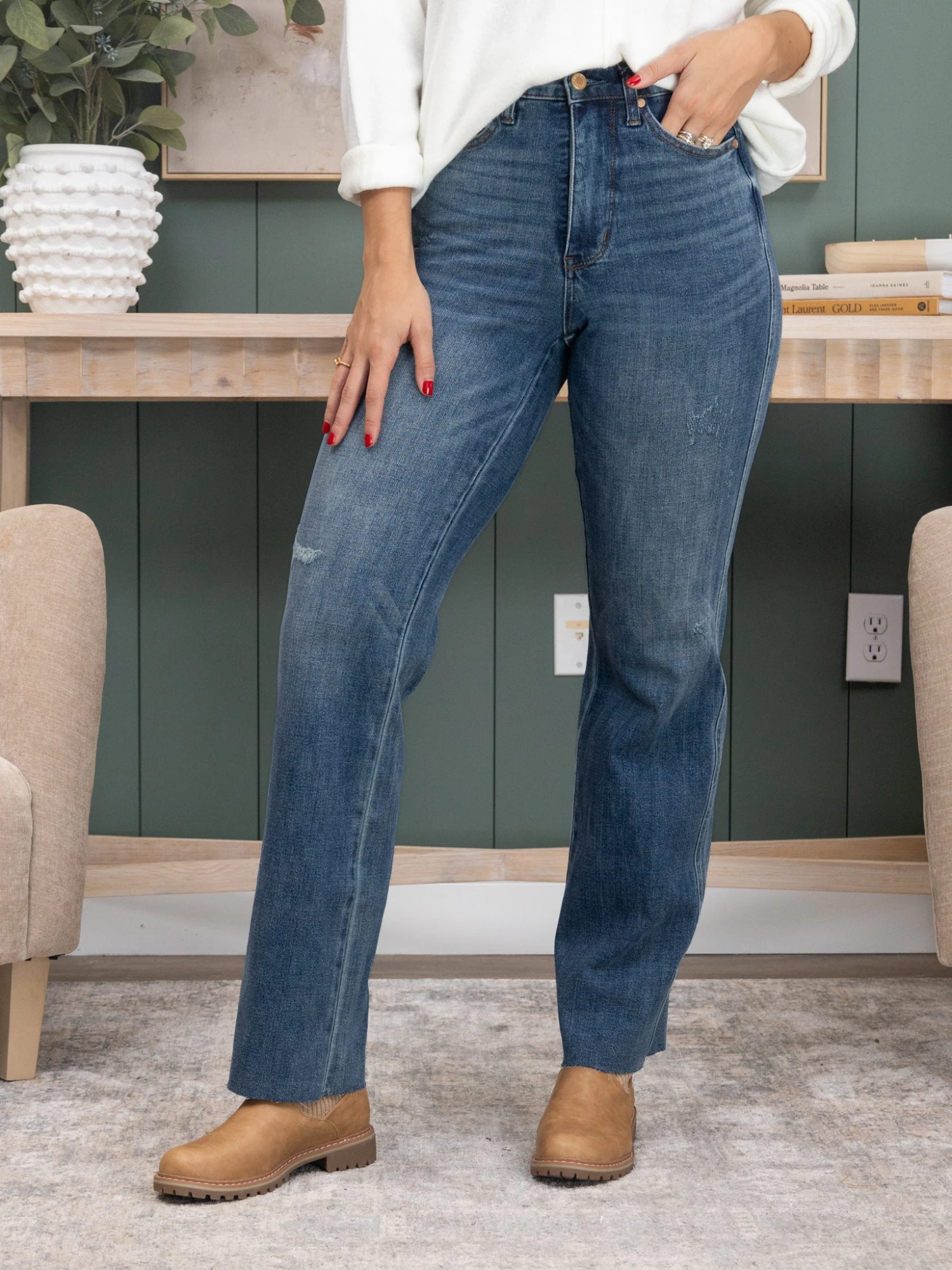 Features: High Waist,Zipper Fly,Tummy Control,Raw Hem Straight Leg