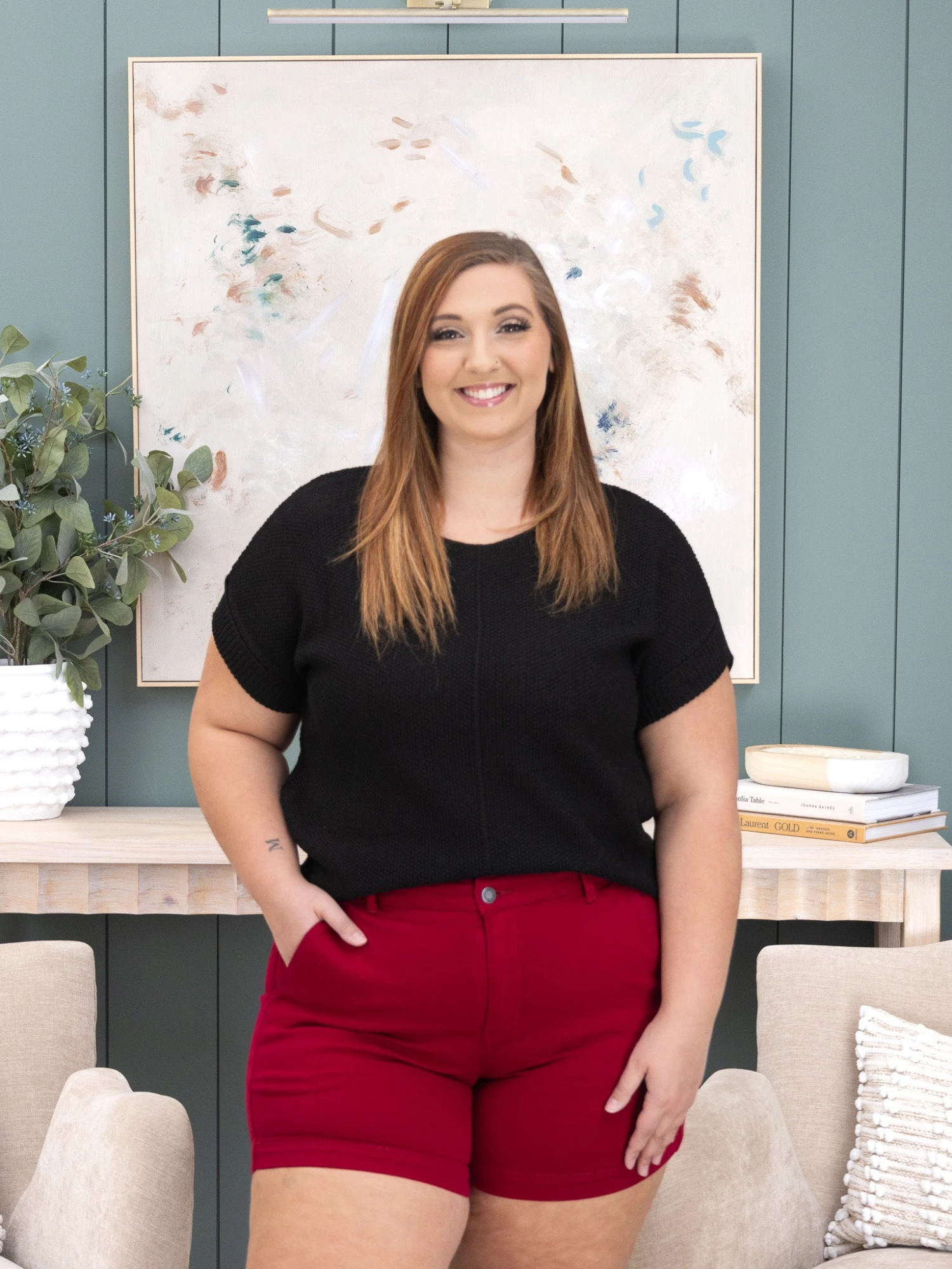 Brittany (short blonde hair) is 5’10, 36B bra, typically wears size S in tops and 3 in denim. Wearing size S