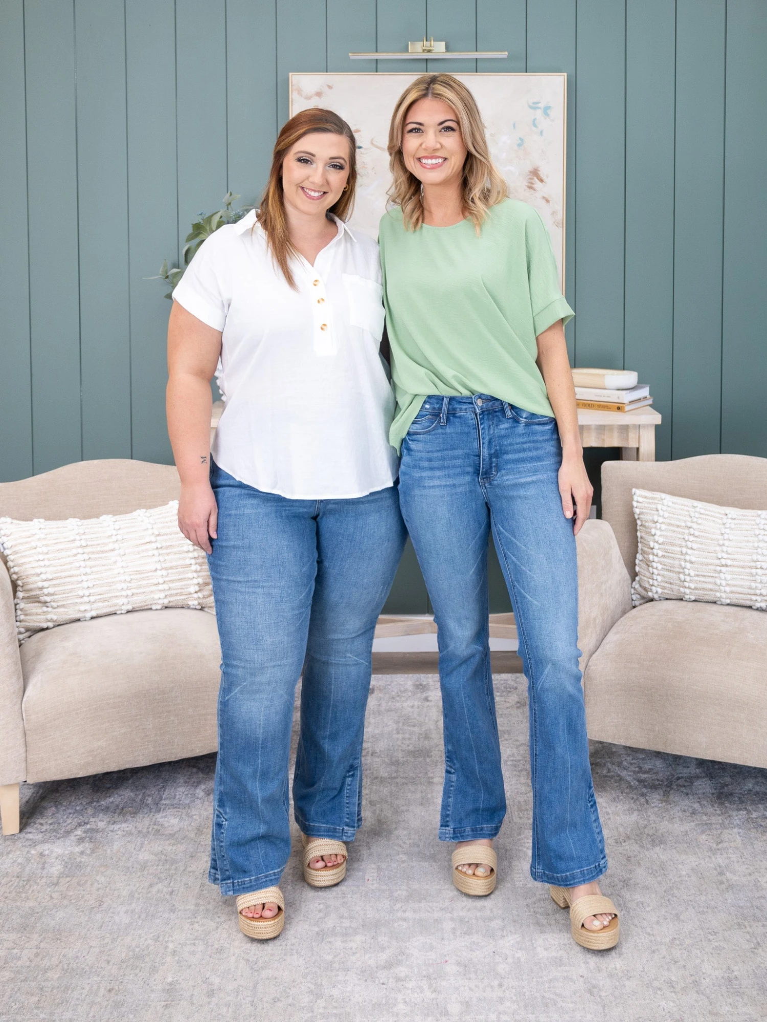 Brittany (short blonde hair) is 5’10, 36B bra, typically wears size S in tops and 3/5 in denim. Wearing size 3.