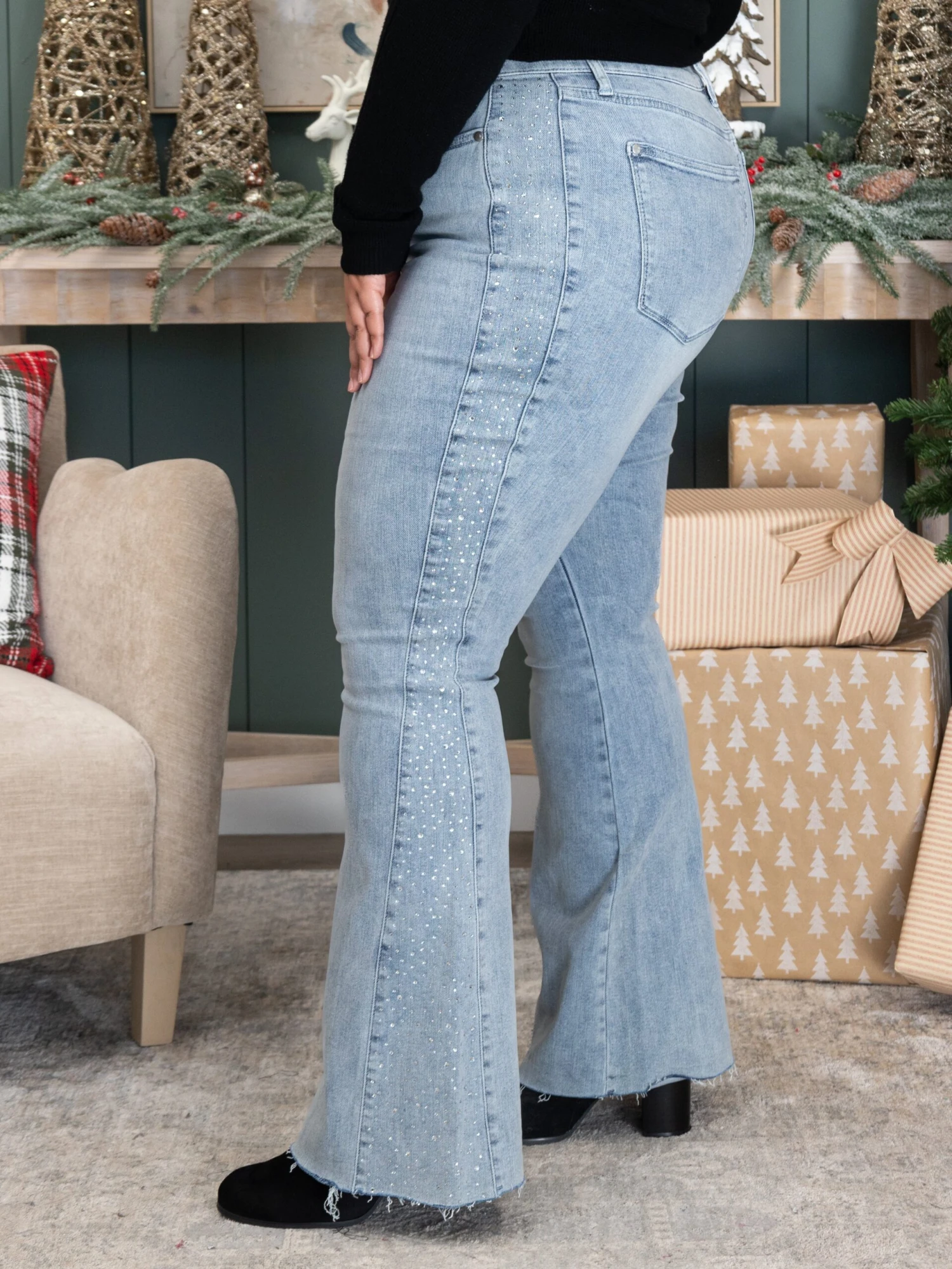 Features: Button Fly,Pockets,Mid Rise, Rhinestone Side Panel,Flare Leg, Raw Hem