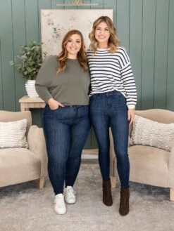 Erin is 5’8, 36C bra, typically wears size L/XL in tops and 14/15 in denim. Wearing size 15. These fit tts, if you are between sizes you can size down to your true Judy Blue size.