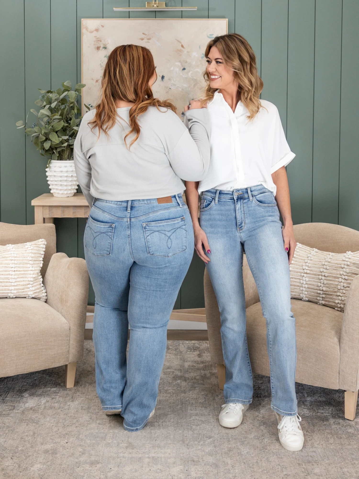 Erin is 5’8, 36C bra, typically wears size L/XL in tops and 14/15 in denim. Wearing size 15. These fit tts, if you are between sizes you can size down to your true Judy Blue size.