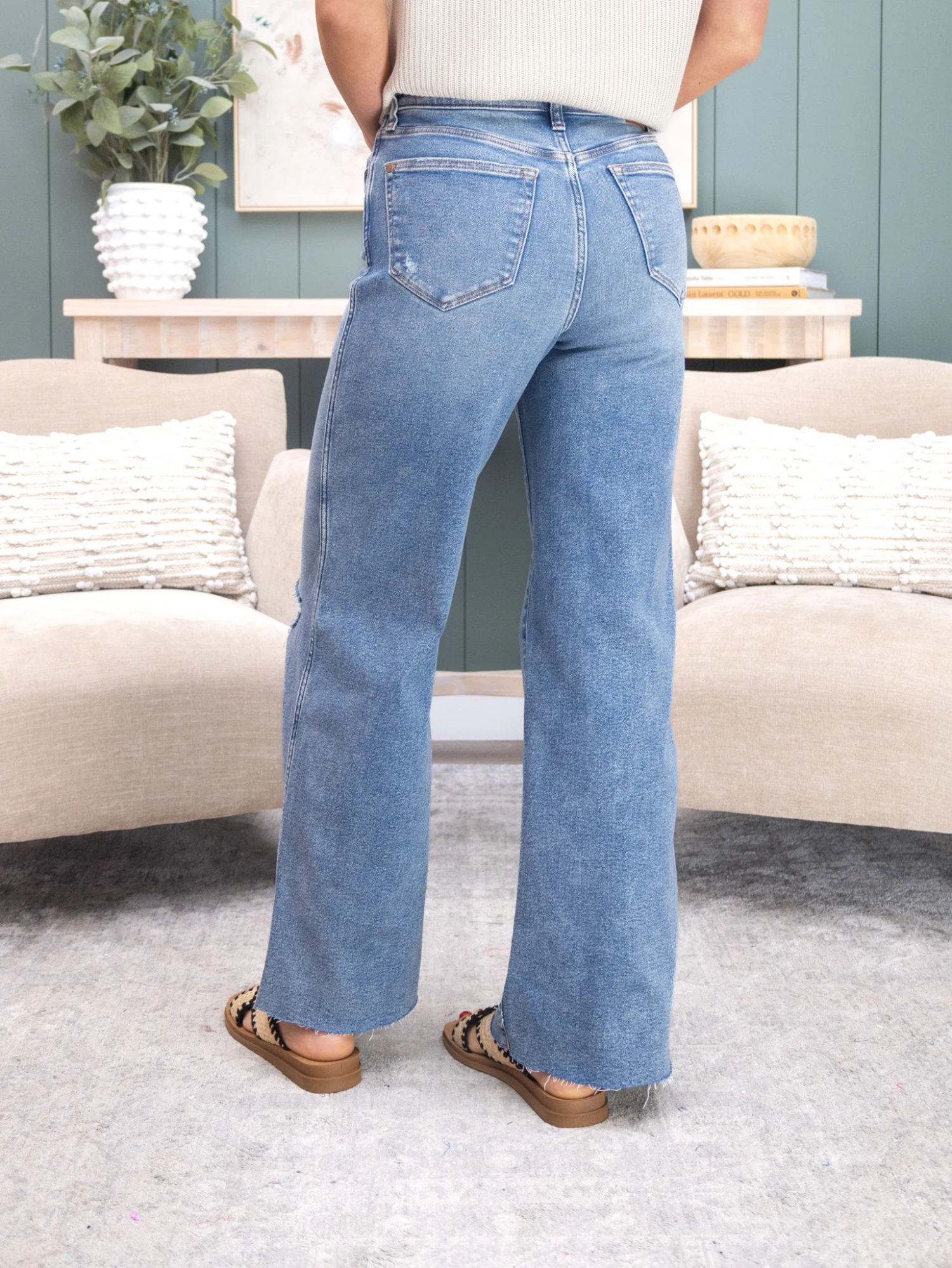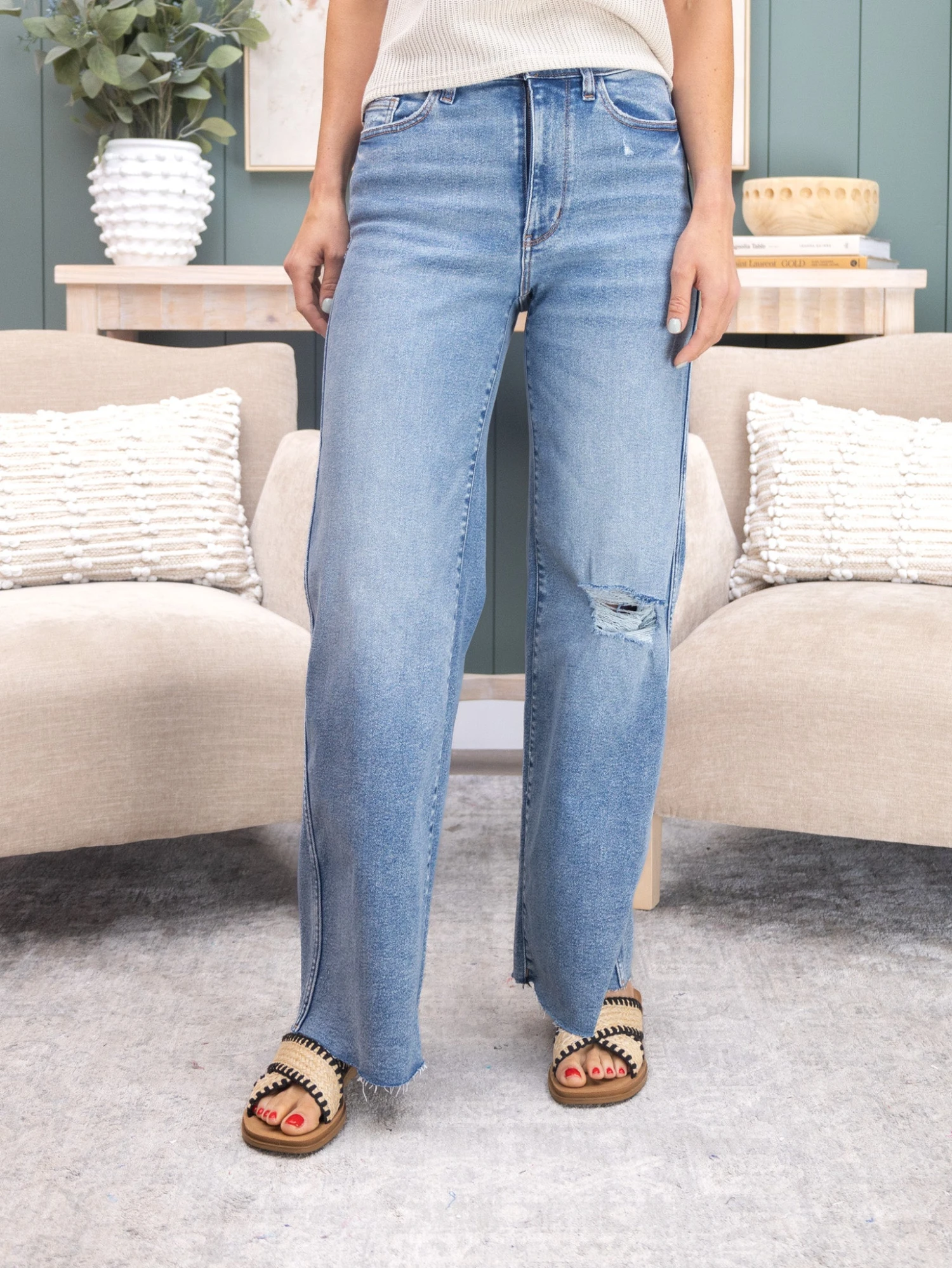 Features: Button/Zipper Fly, High Rise, Destroyed Knee, Raw Hem, Retro Wide Leg
