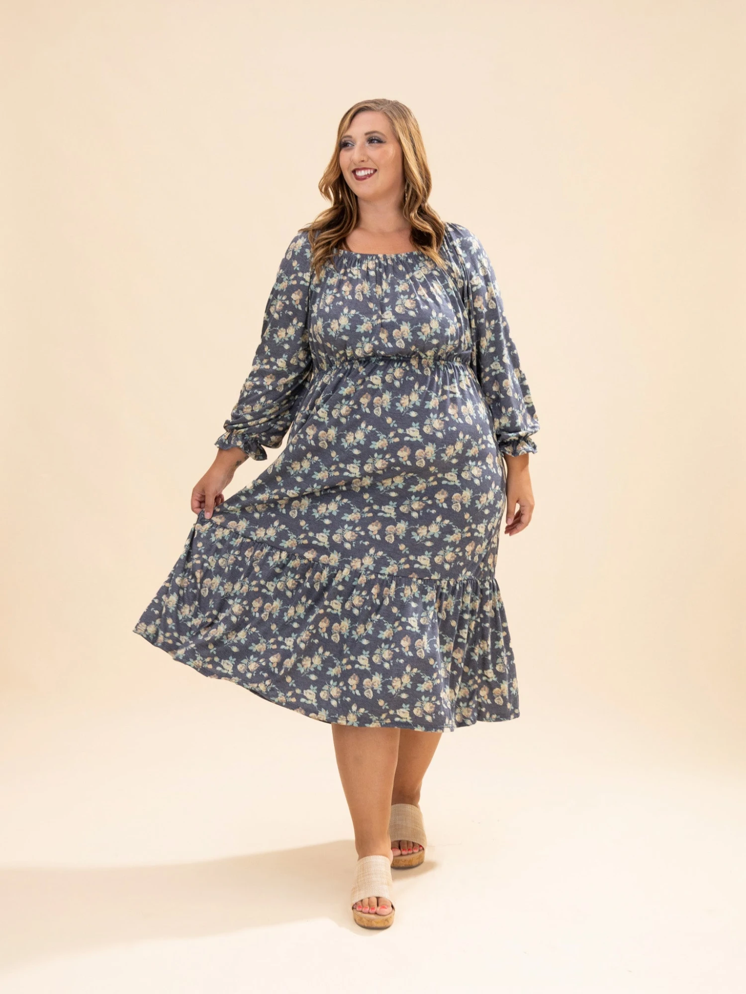 Features: Square Neck, Long Sleeves, Floral Print