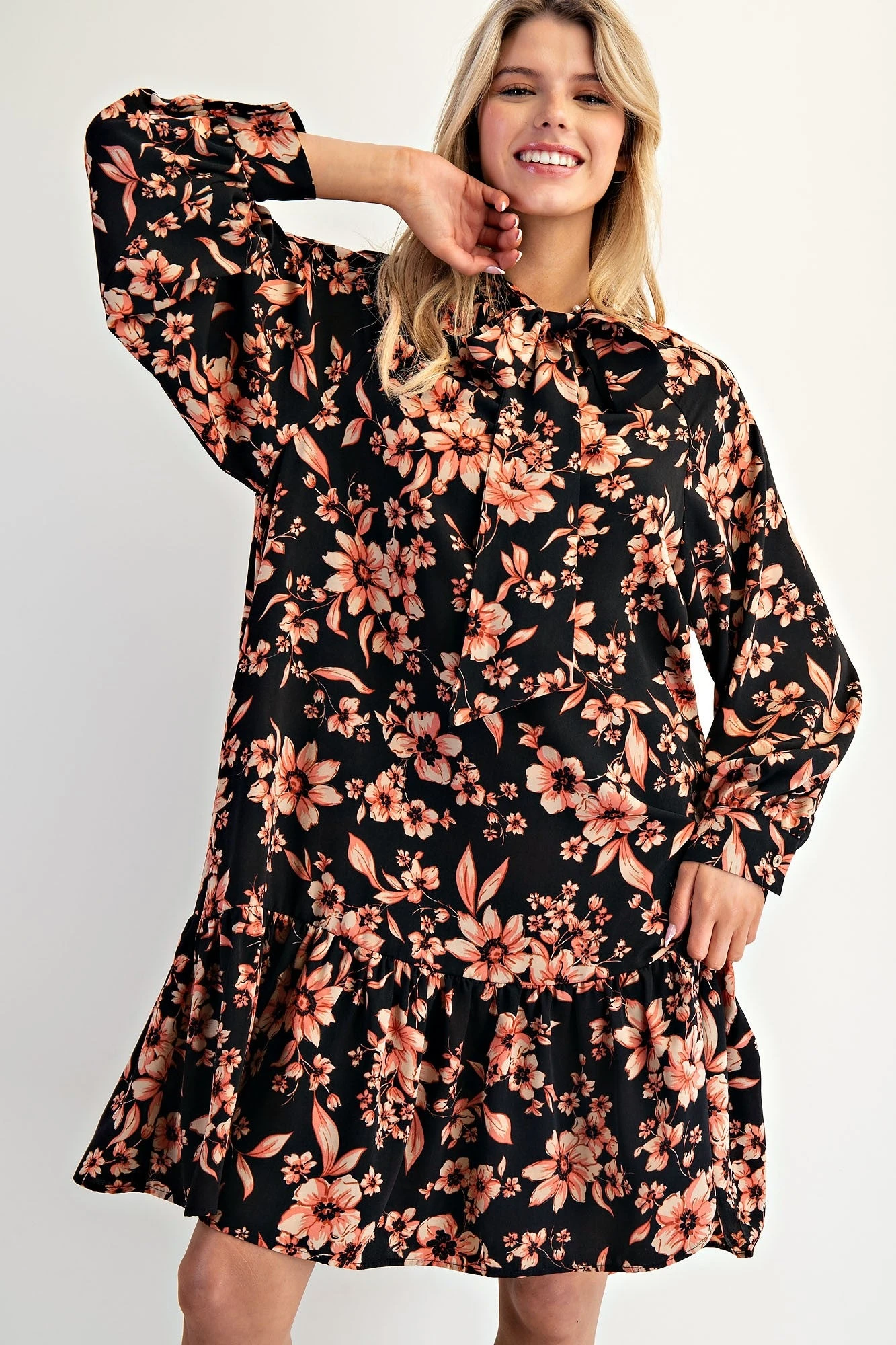 Features: Long Sleeve, Floral Print, Ruffle Bottom, Dress