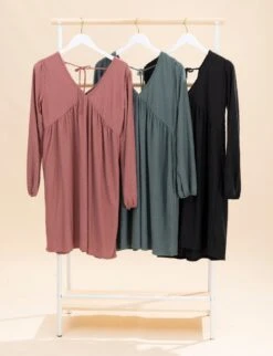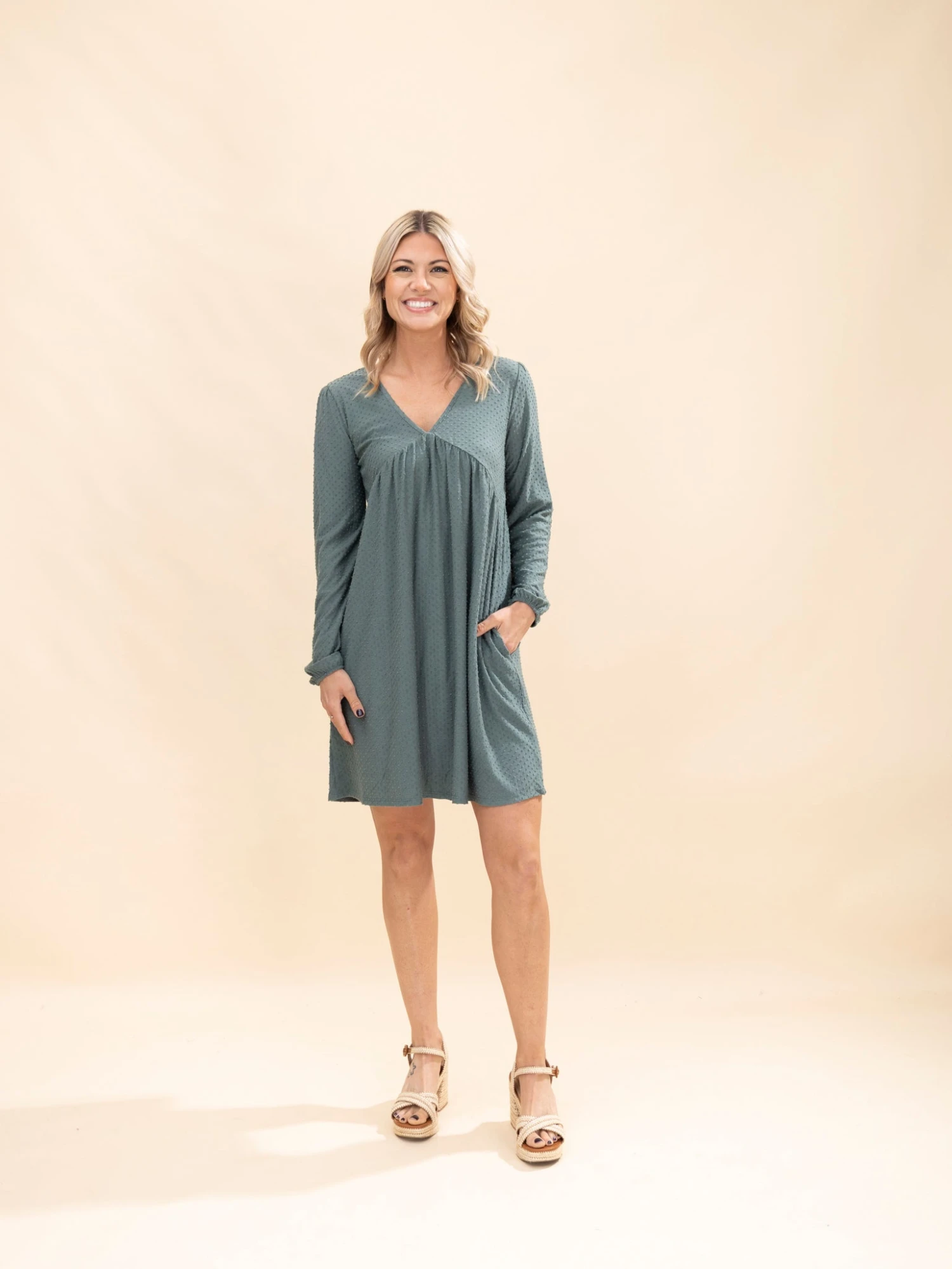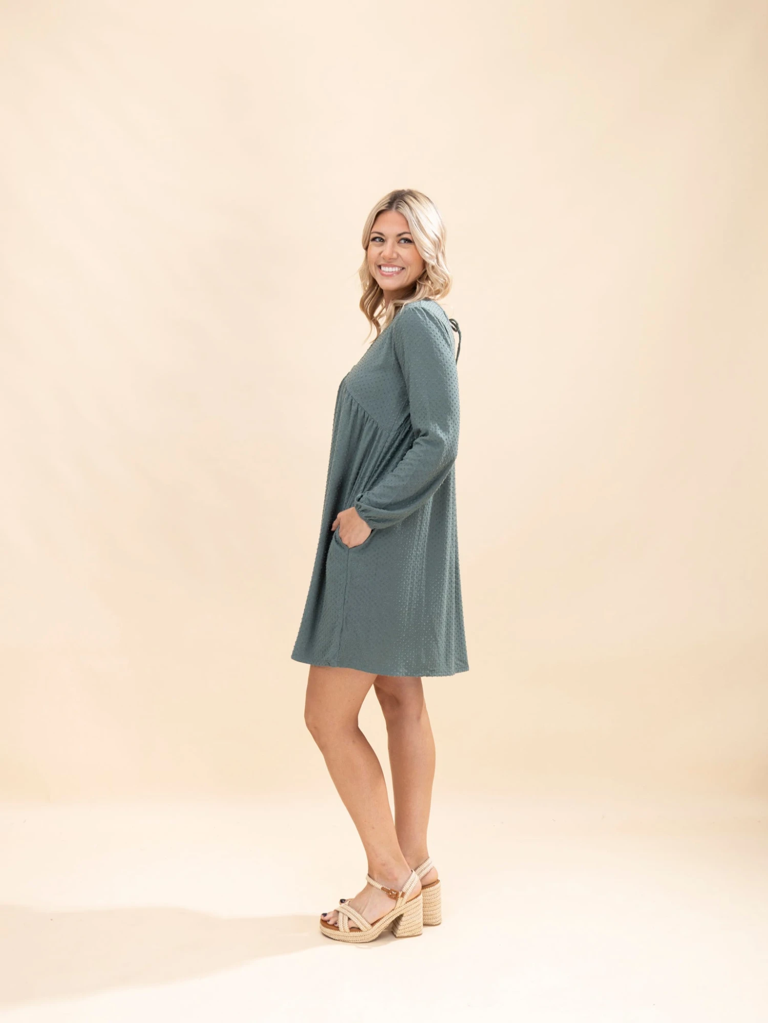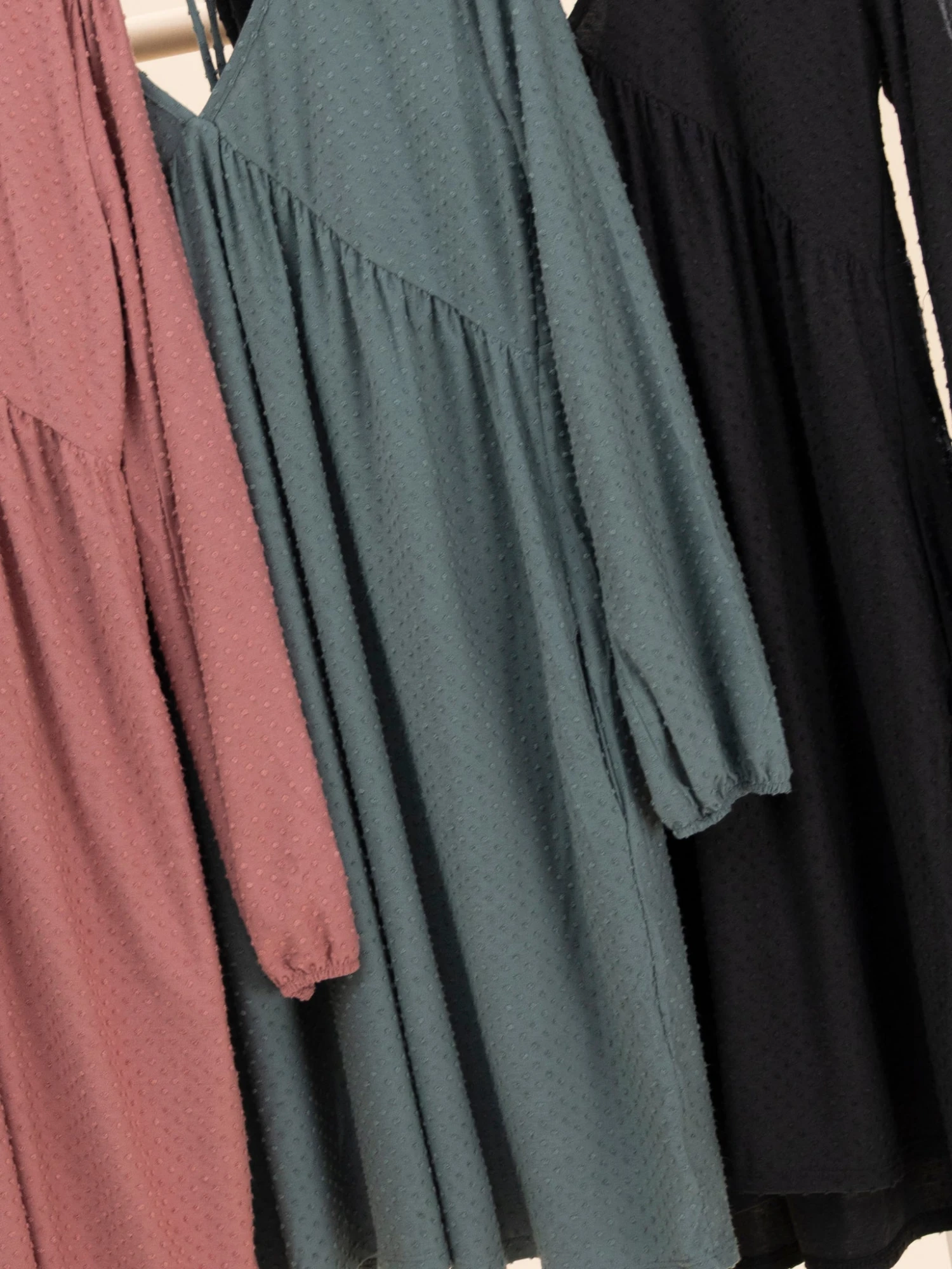 Features: Long Sleeve, Swiss Dot, V Neck, Baby Doll, Pockets, Tie Back