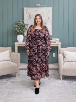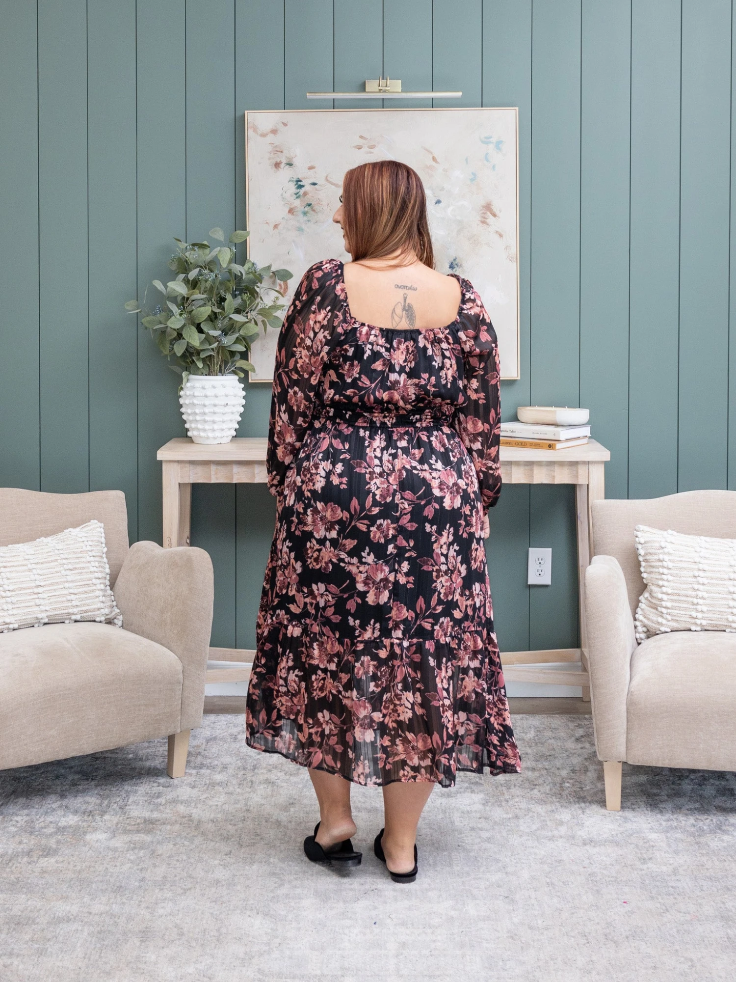 Features: Square Neck,Sheer Long Sleeves,Elastic Waist,Lurex Floral Printed Tiered Midi Dress