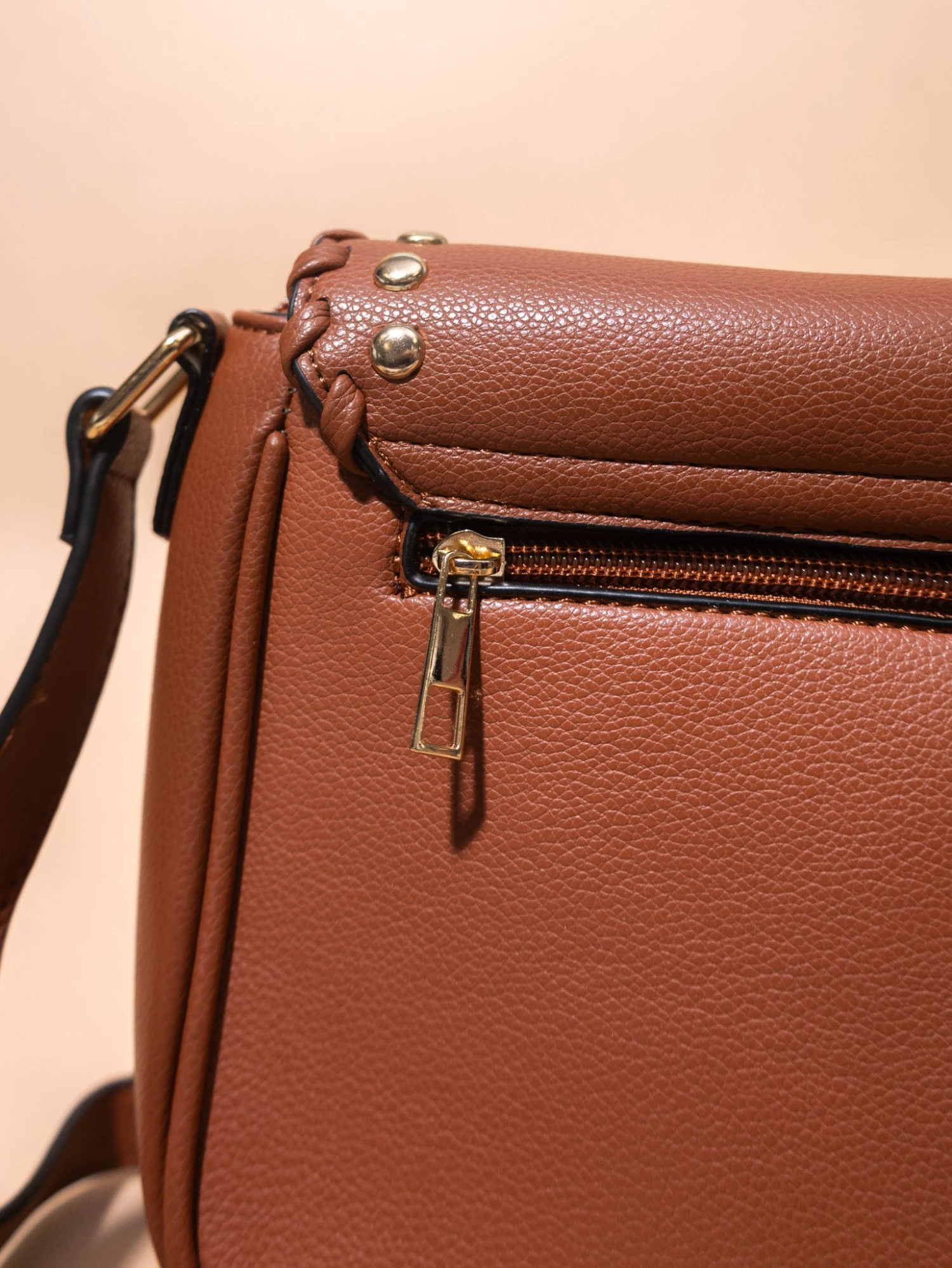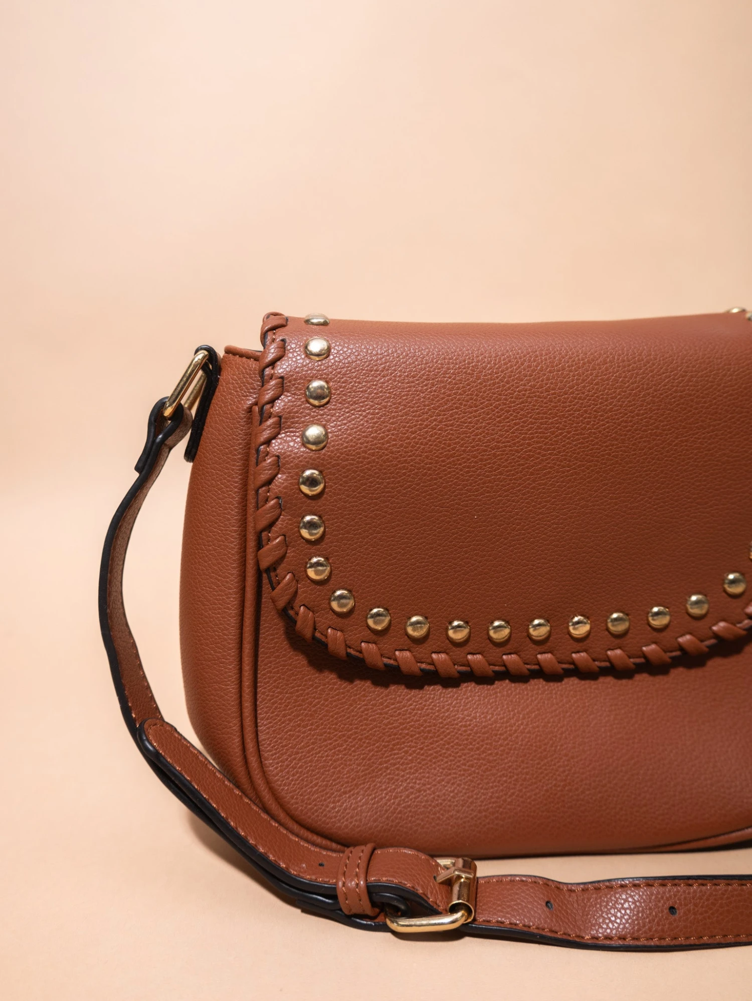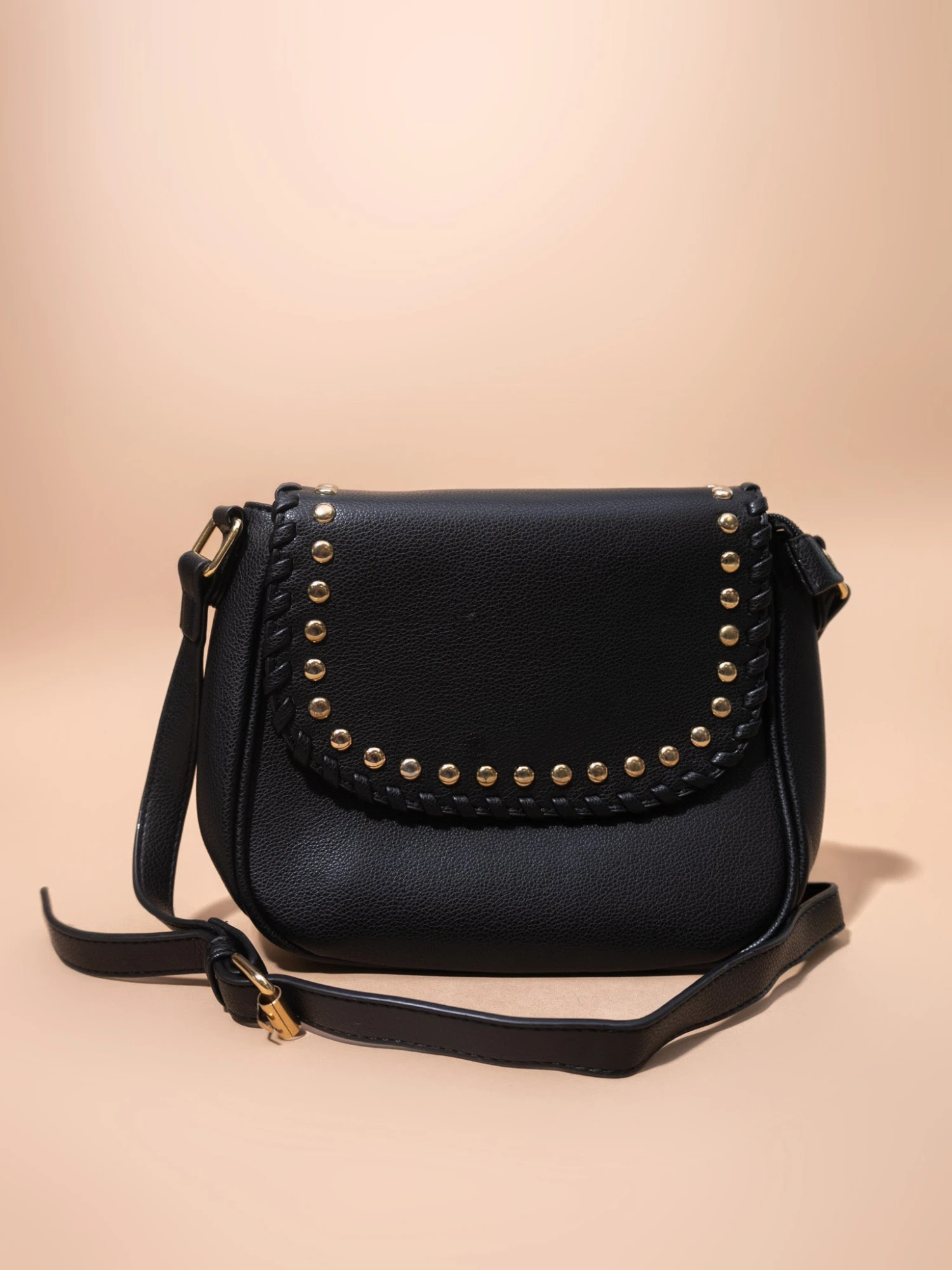 Features: Adjustable Strap. Button / Zipper Closure, Inside & Outside Zipper, Studded Bag