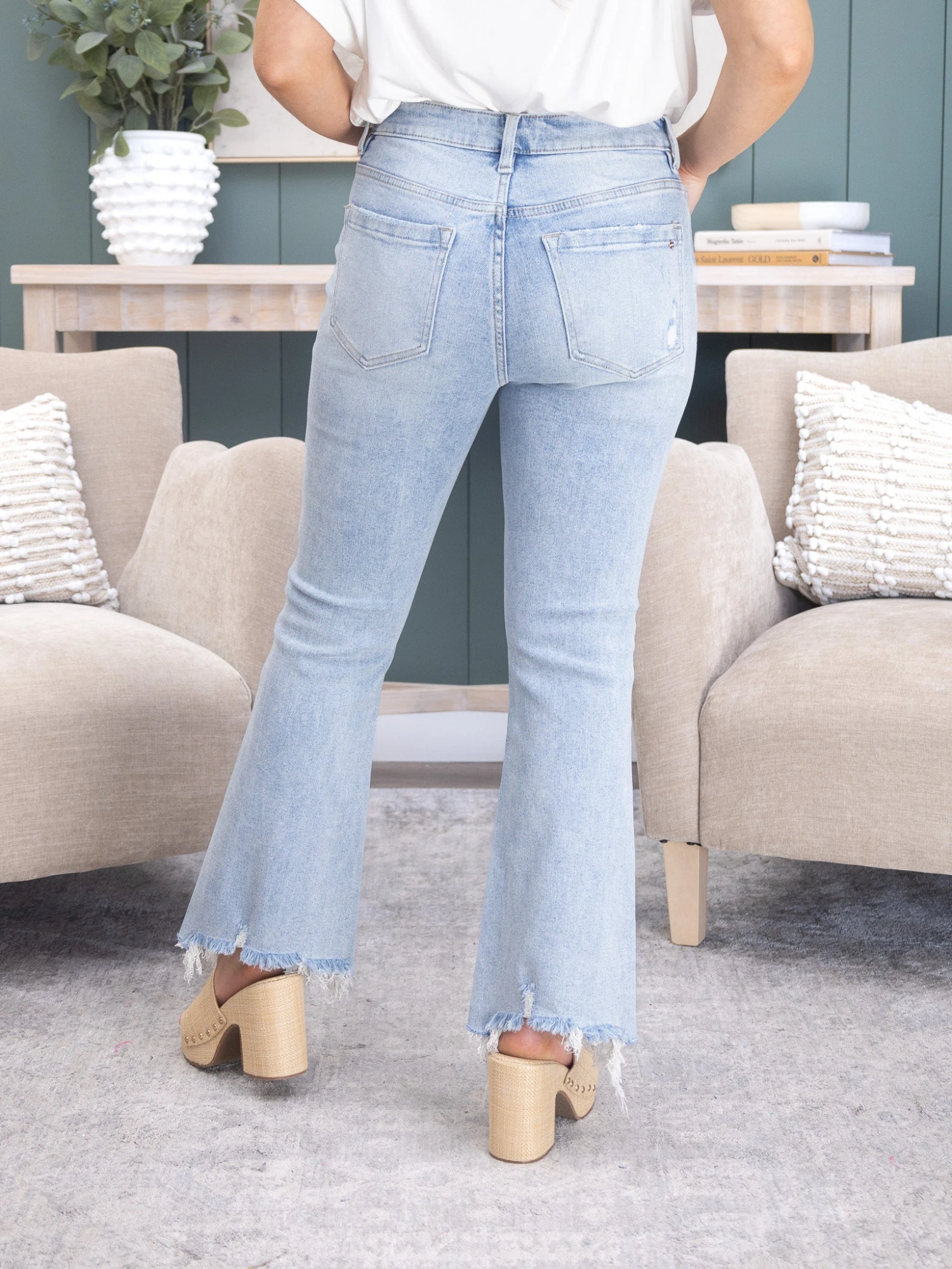 Features: High Rise, Shark Bite Hem, Slight Distressing, Cropped Flare Jean