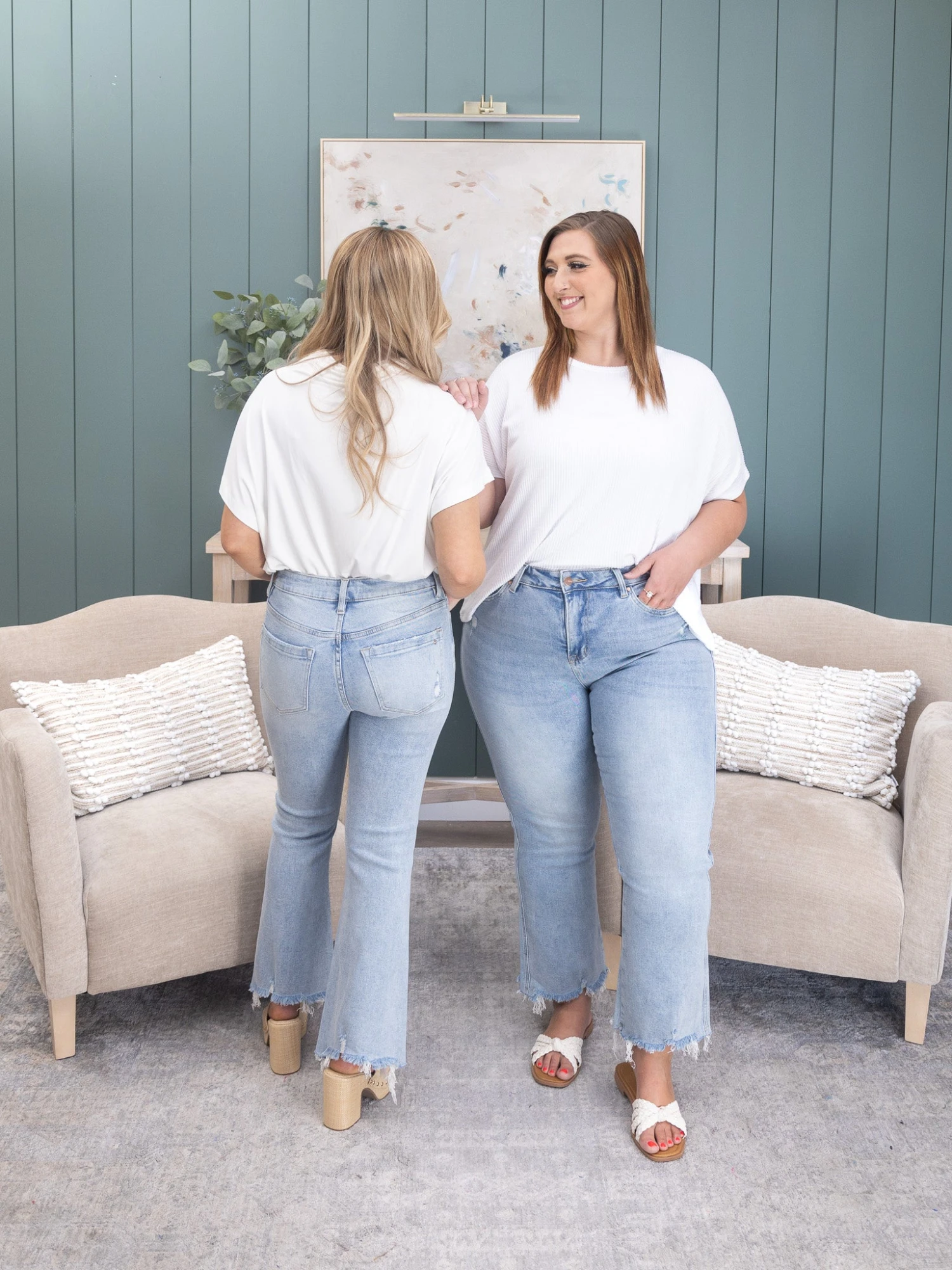 Crimsen (long blonde hair) is 5’1, 34B bra, typically wears size S in tops and 3 in denim. Wearing size 3