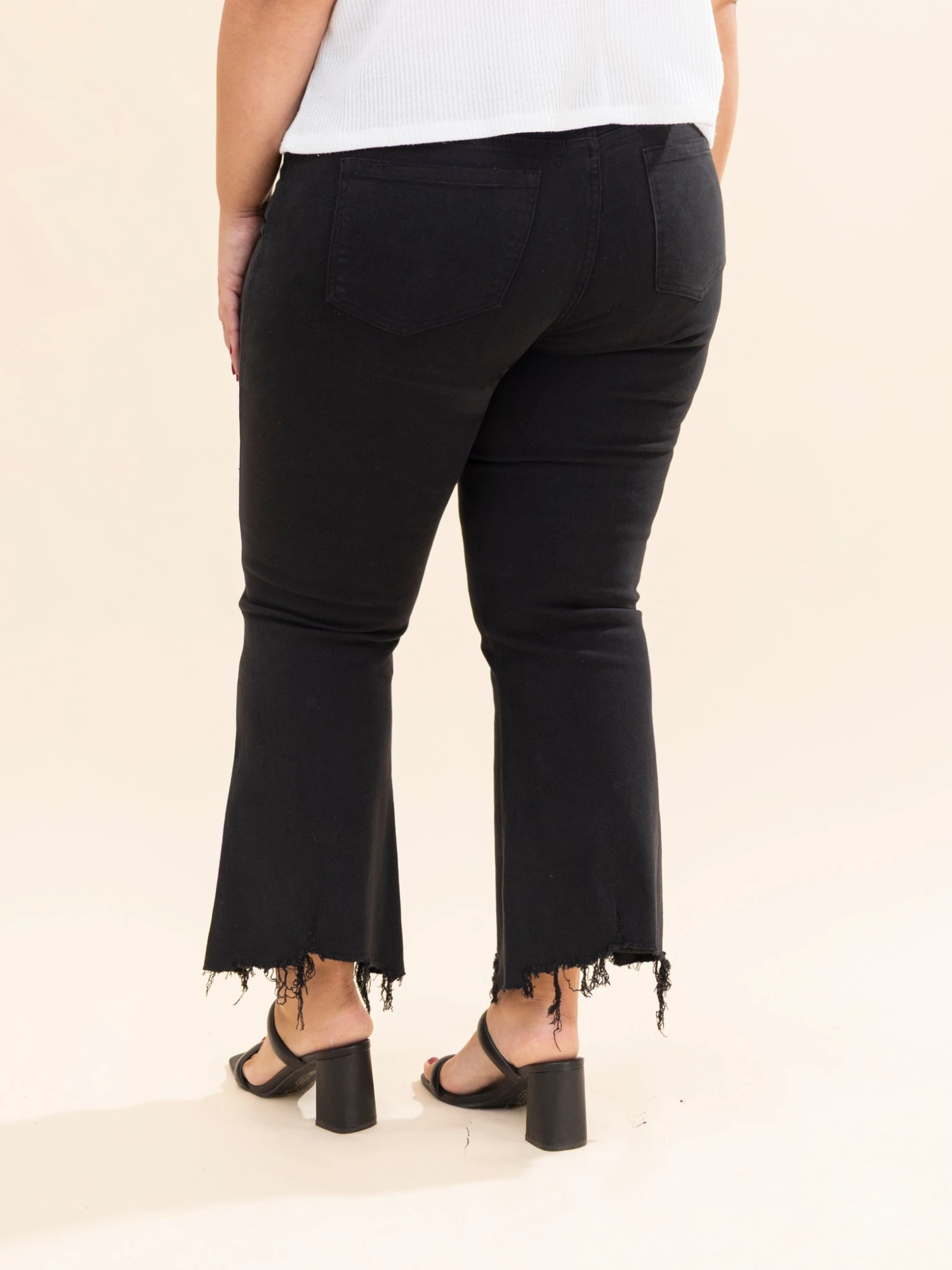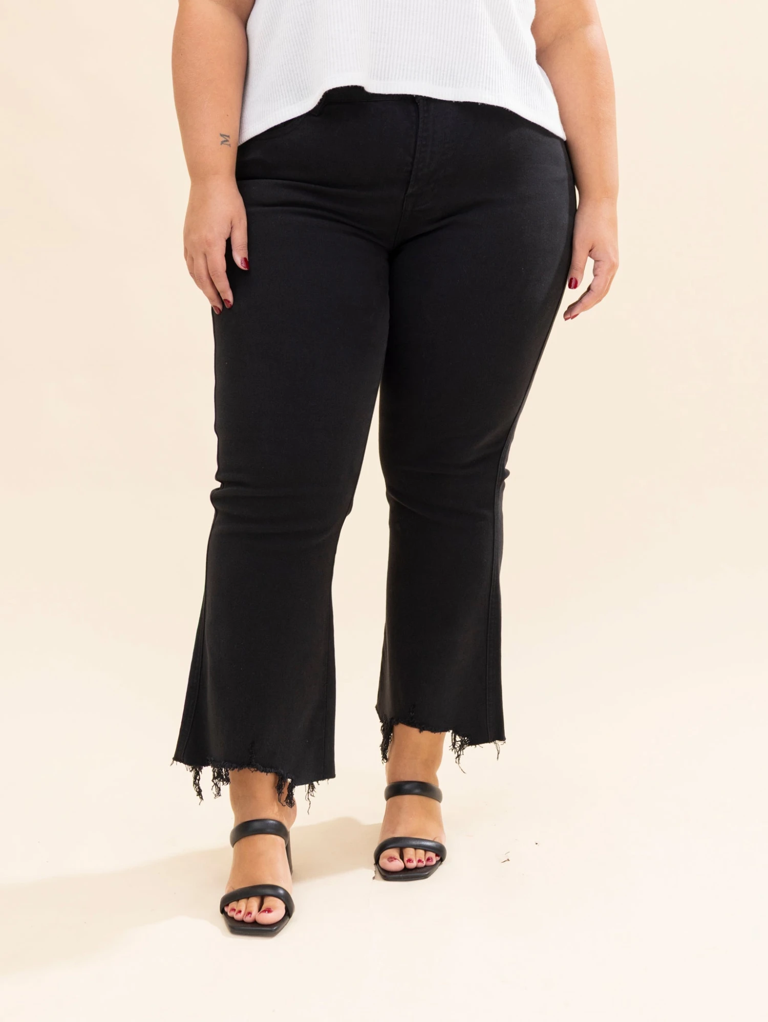 Features: High Rise, Crop, Flare Jeans with Uneven Hem