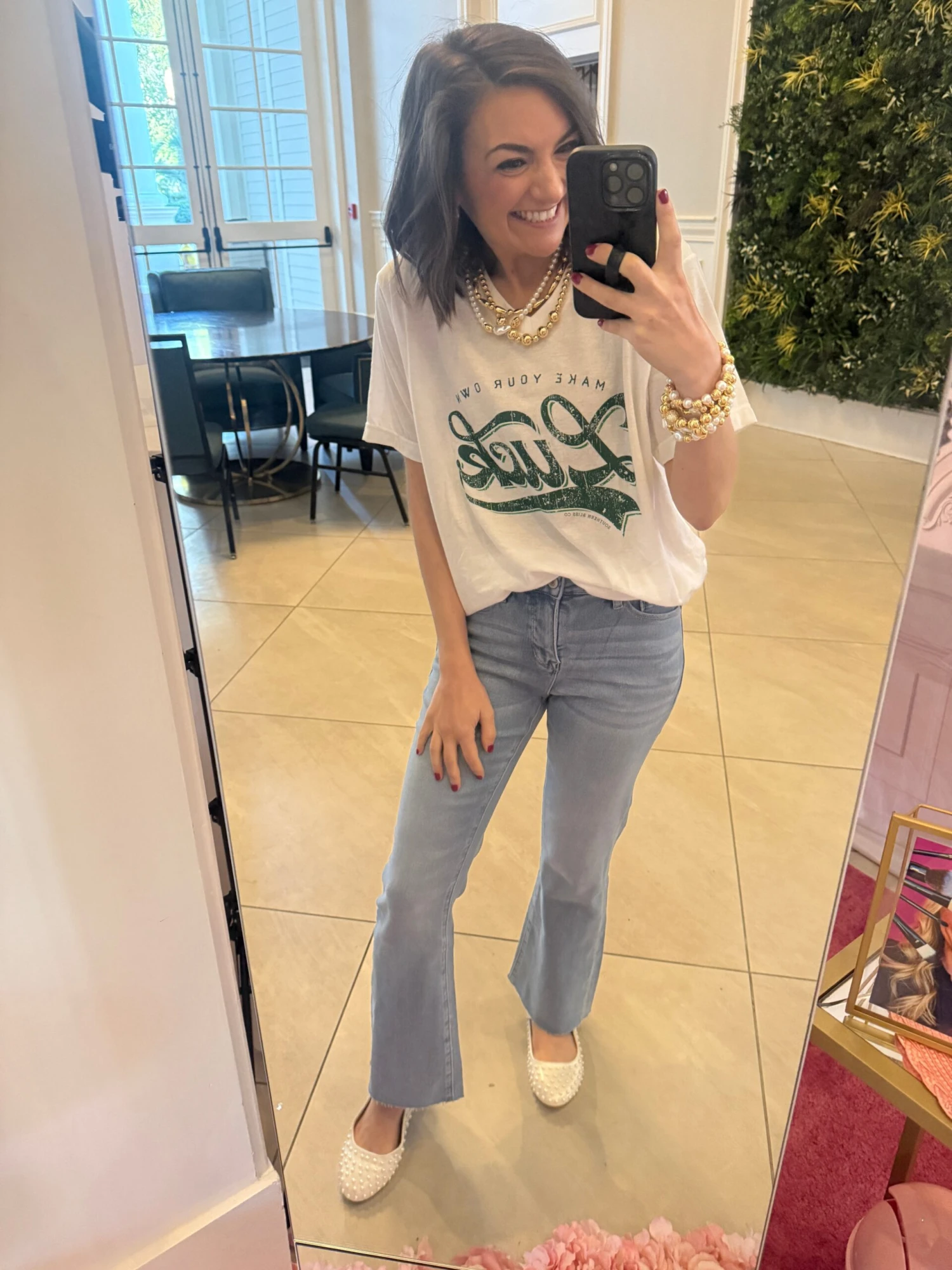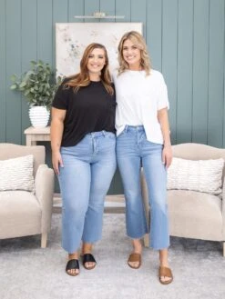 Brittany (short blonde hair) is 5’10, 36B bra, typically wears size S in tops and 3/5 in denim. Wearing size 3.