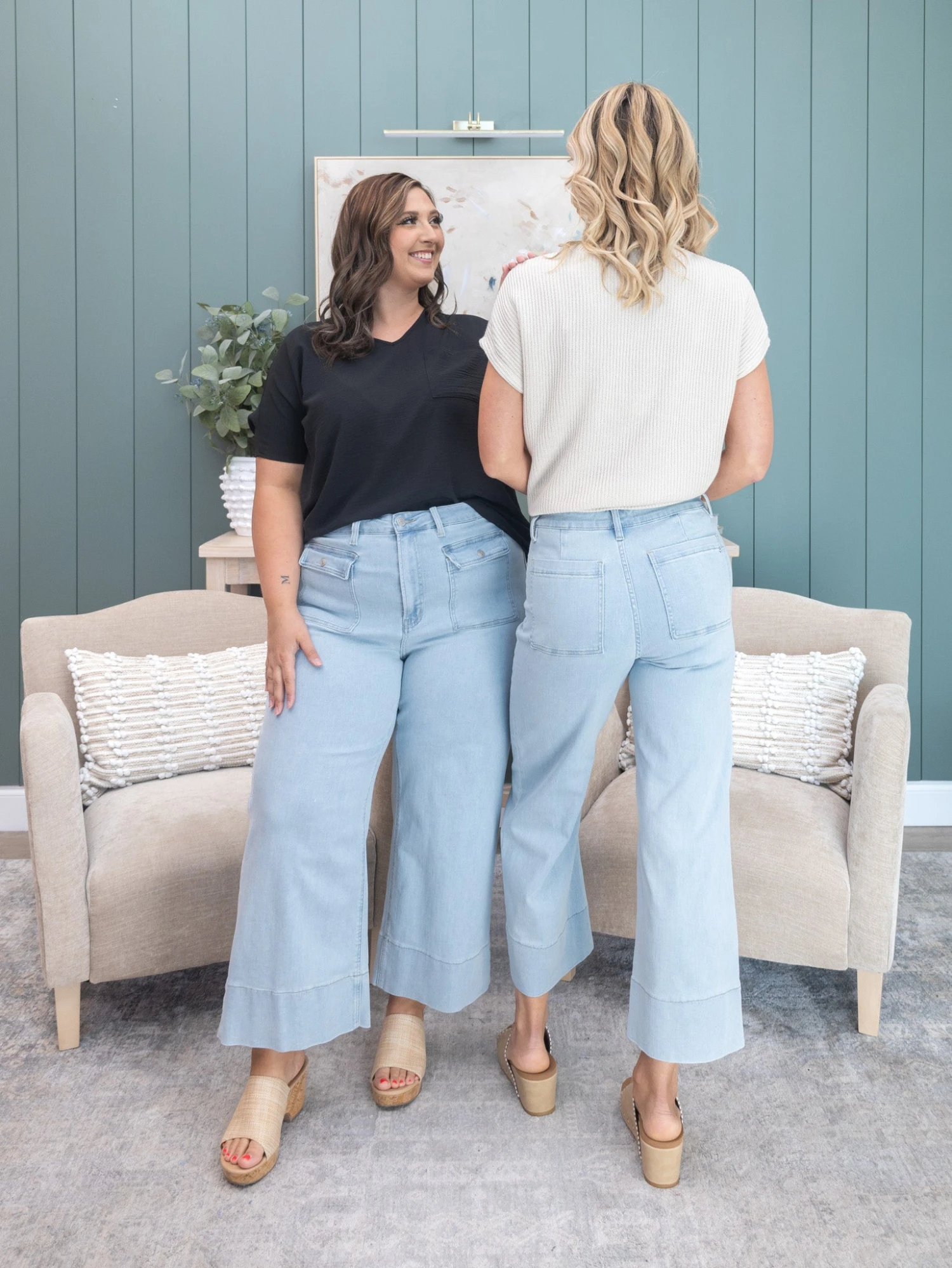 Brittany (short blonde hair) is 5’10, 36B bra, typically wears size S in tops and 3 in denim. Wearing size 3