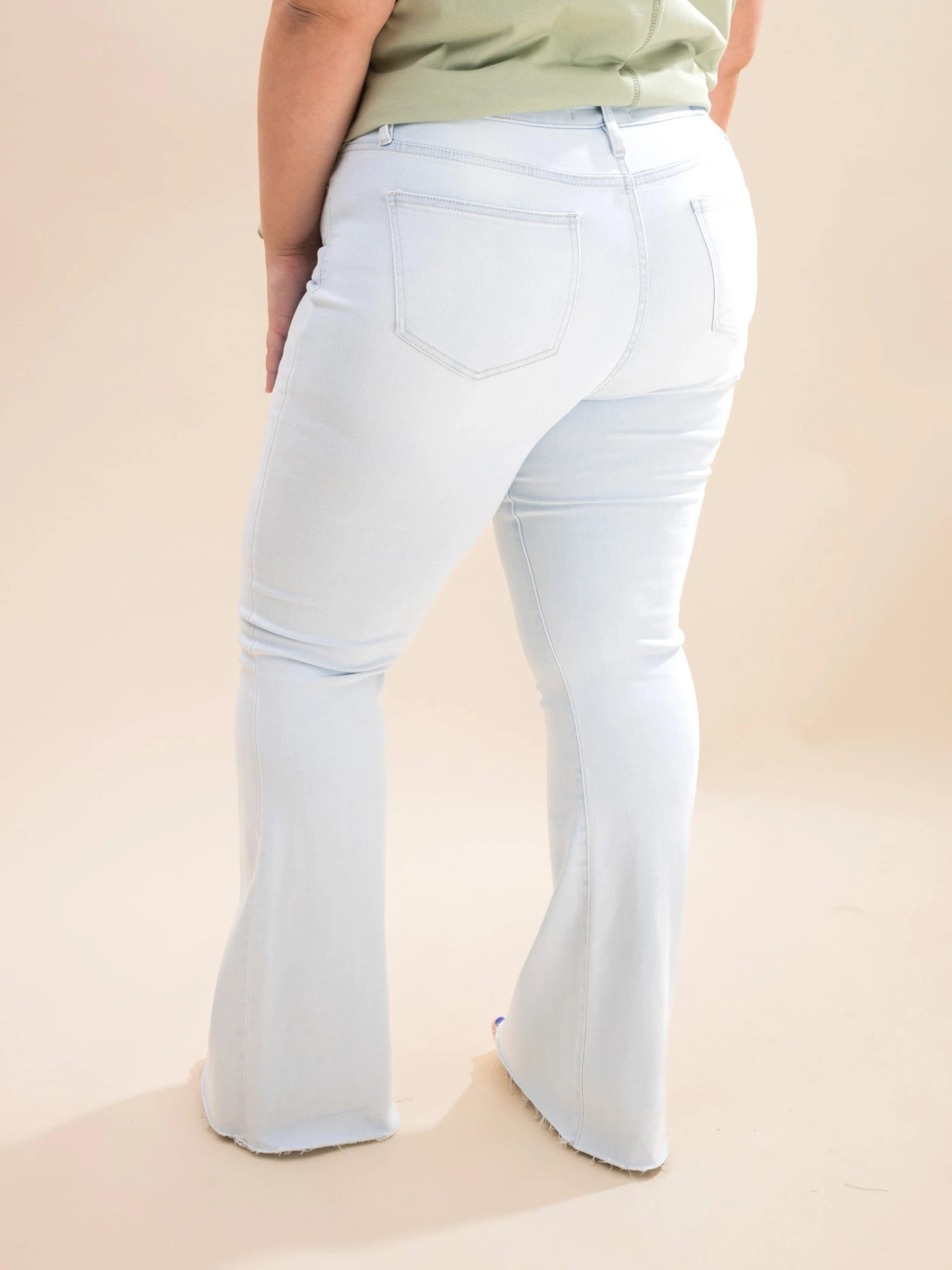 Features: Button/Zipper Waist, High Rise, Flared Raw Hem Jean