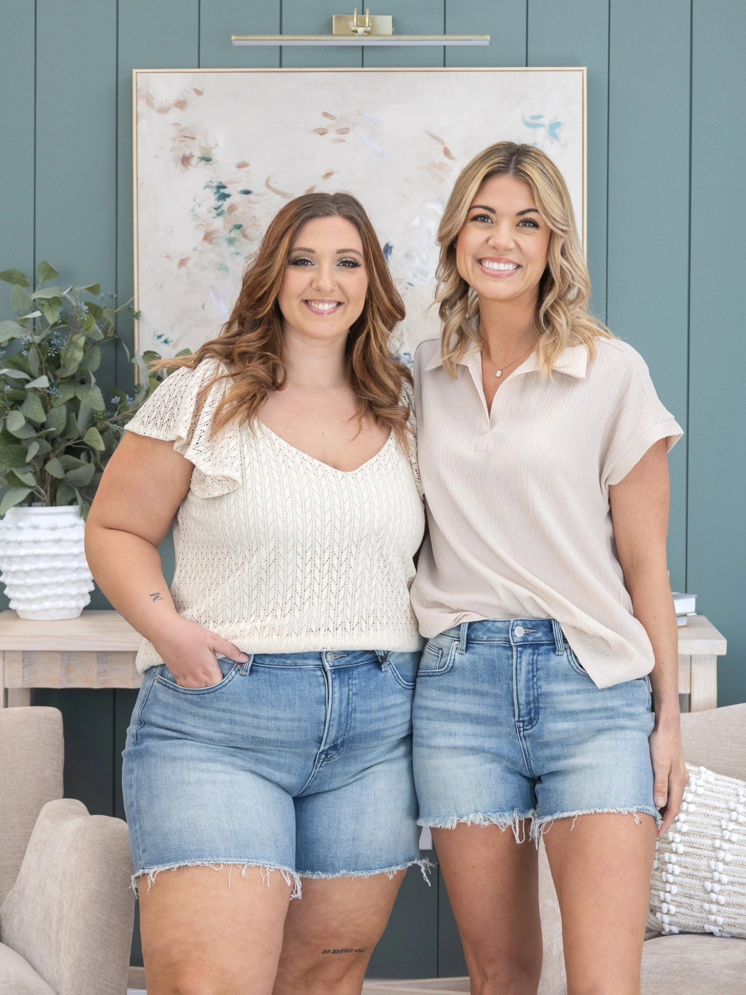 Brittany (short blonde hair) is 5’10, 36B bra, typically wears size S in tops and 3 in denim. Wearing size S