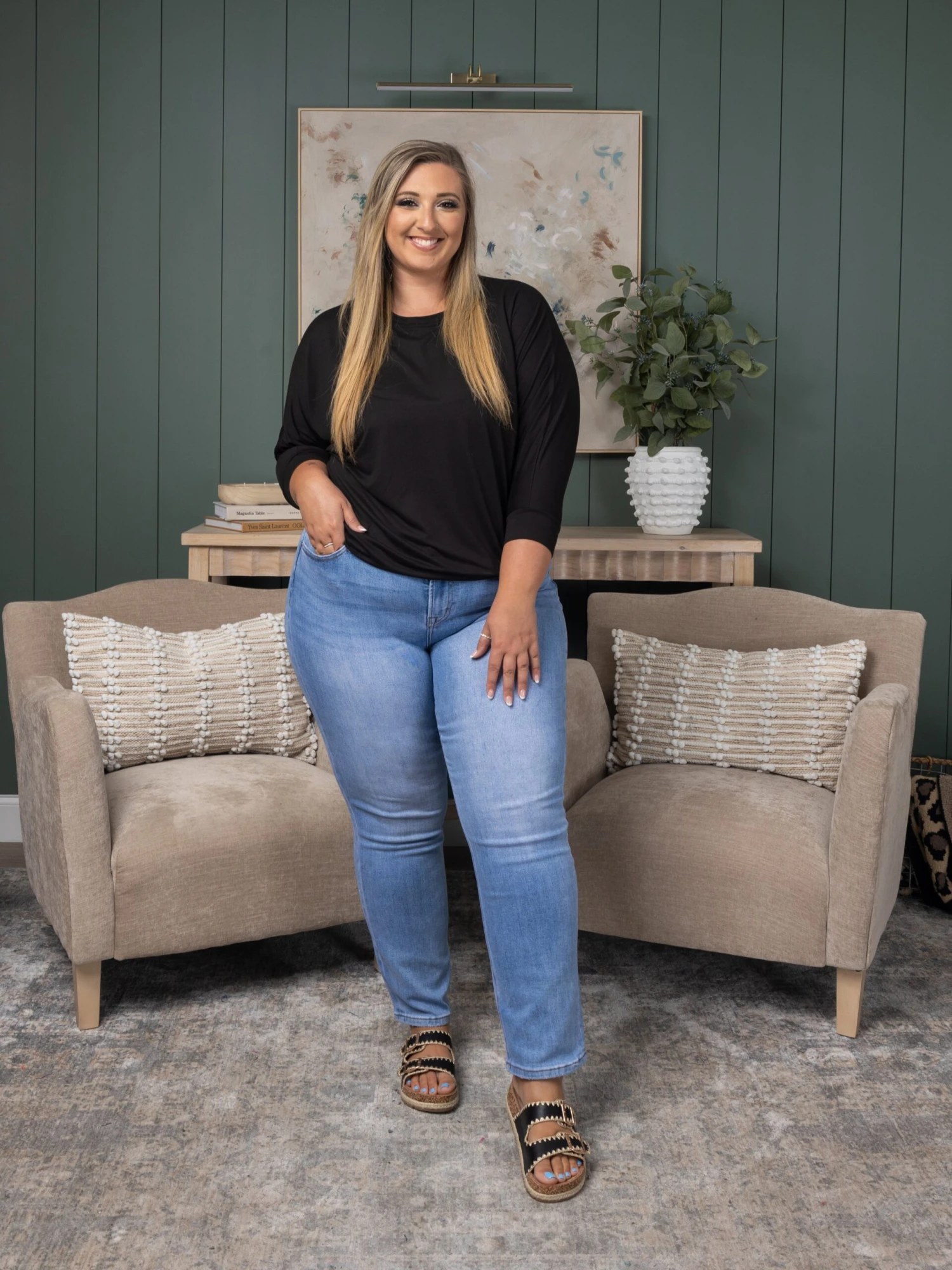 Erin is 5’8, 36C bra, typically wears size L/XL in tops and 14/16 in denim. Wearing size 15