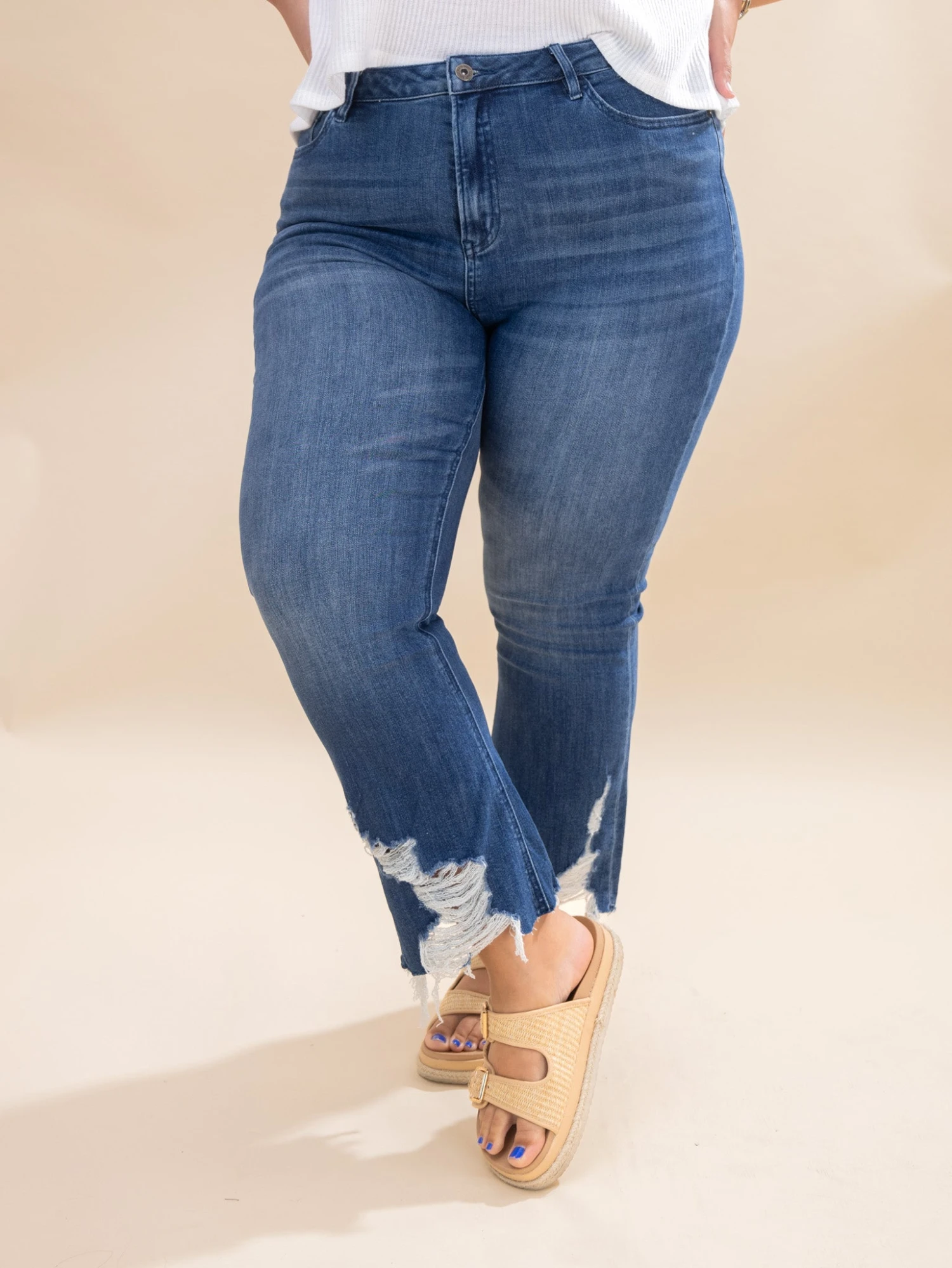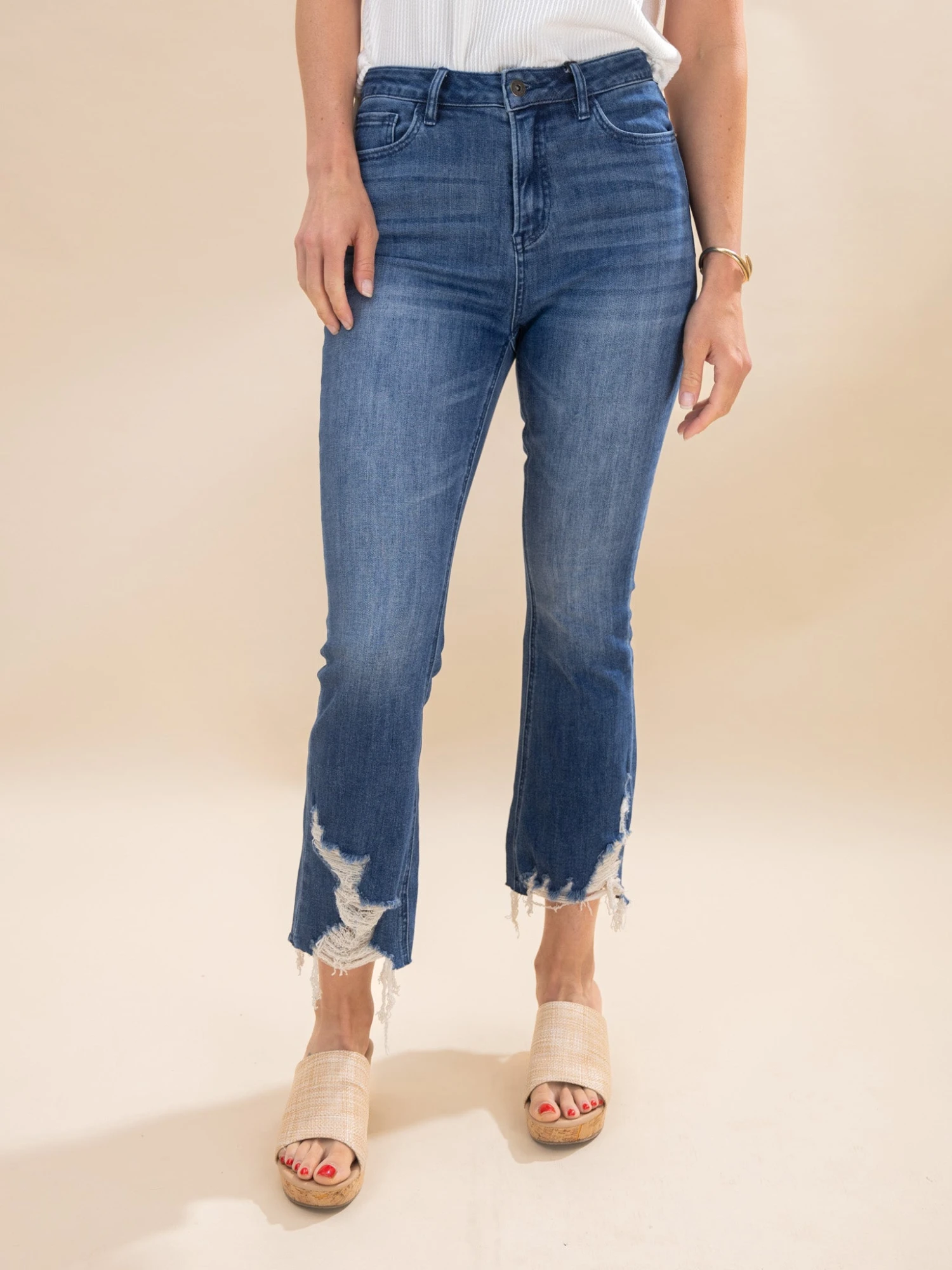 Features: Button/Zipper Waist, Super High Rise, Destroyed Hem, Cropped Flare Leg