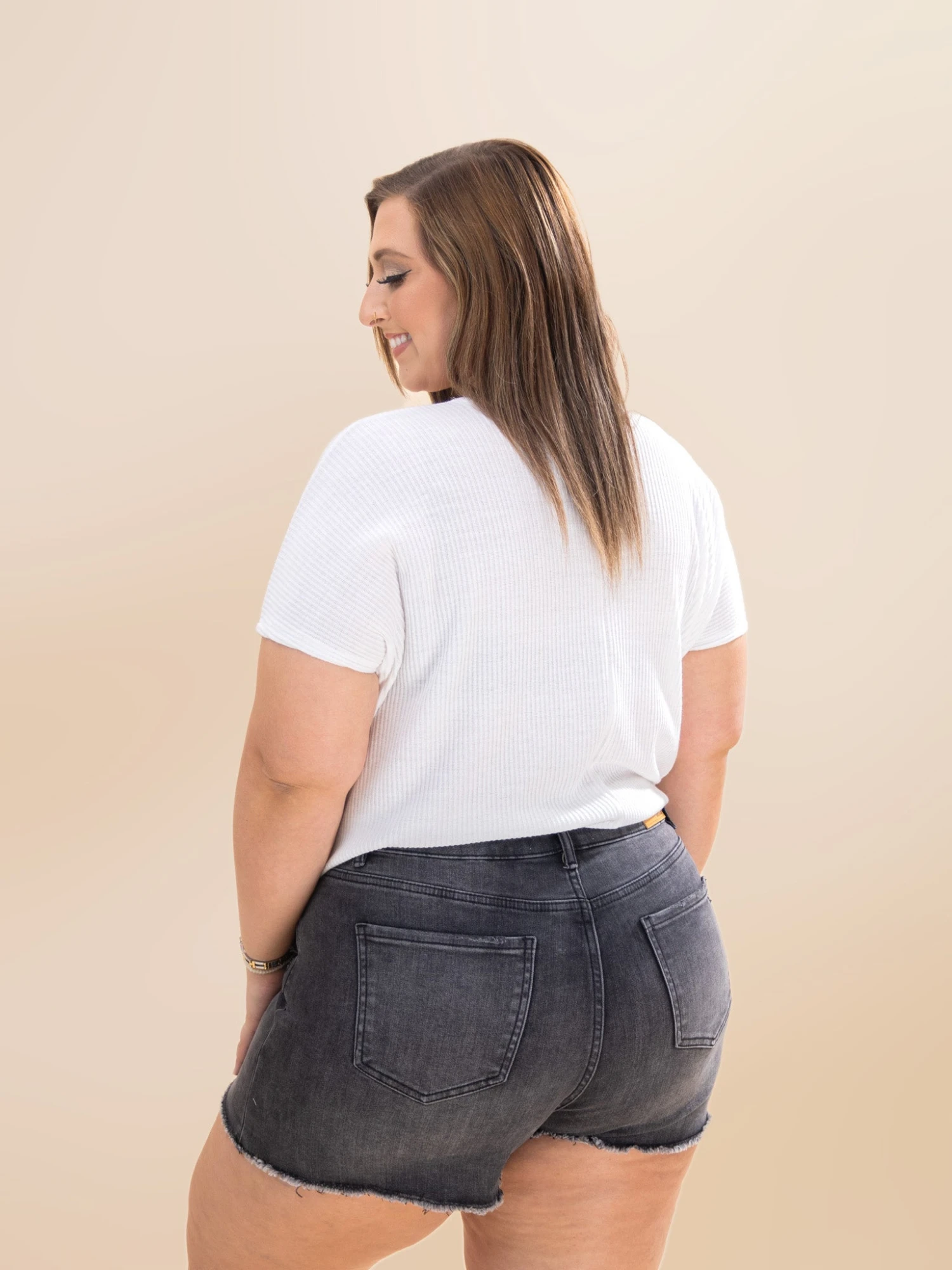 Features: Hidden Button Fly, Super High Rise, Distressing, Frayed Hem