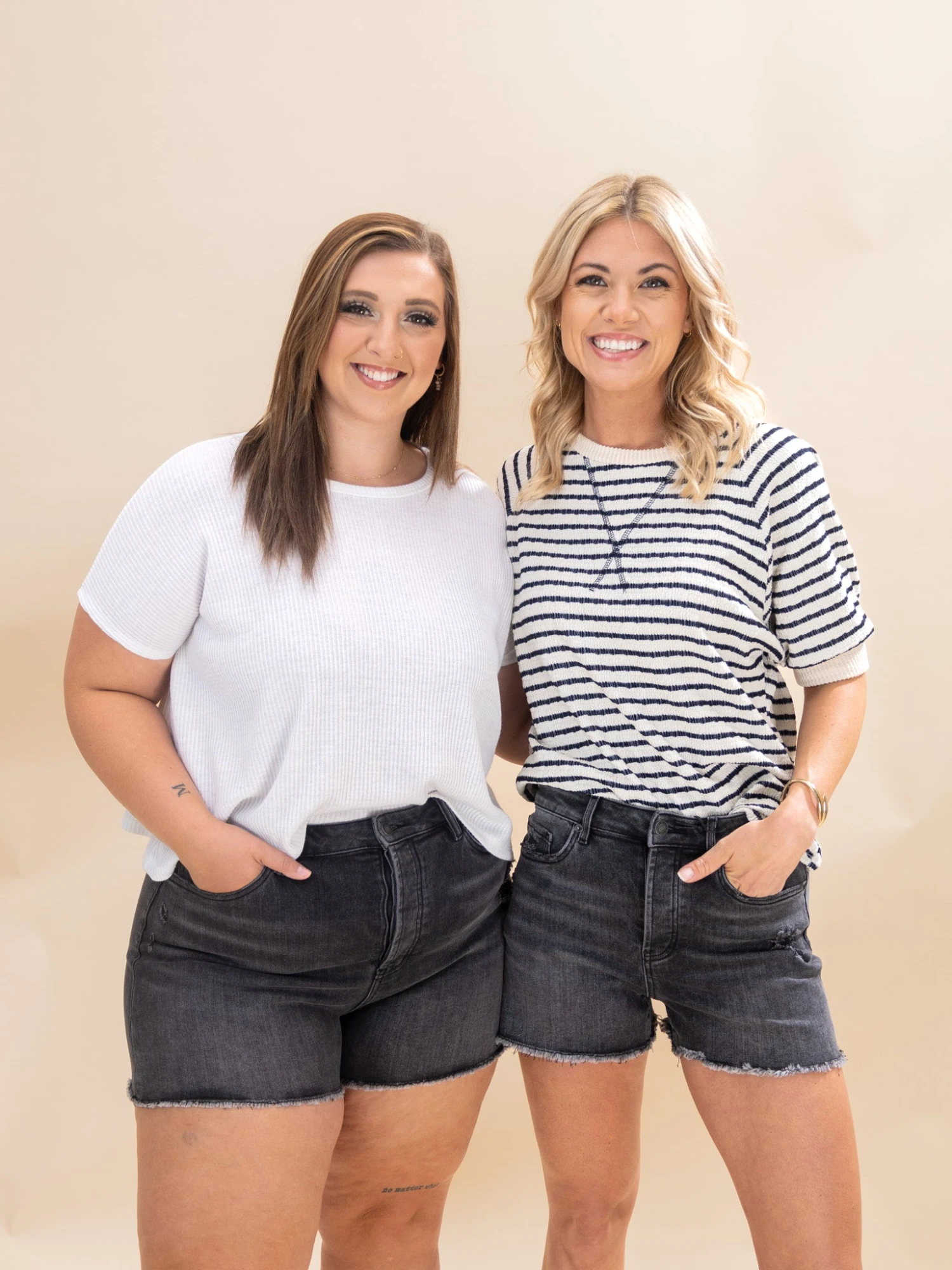 Brittany (short blonde hair) is 5’10, 36B bra, typically wears size S in tops and 3 in denim. Wearing size S
