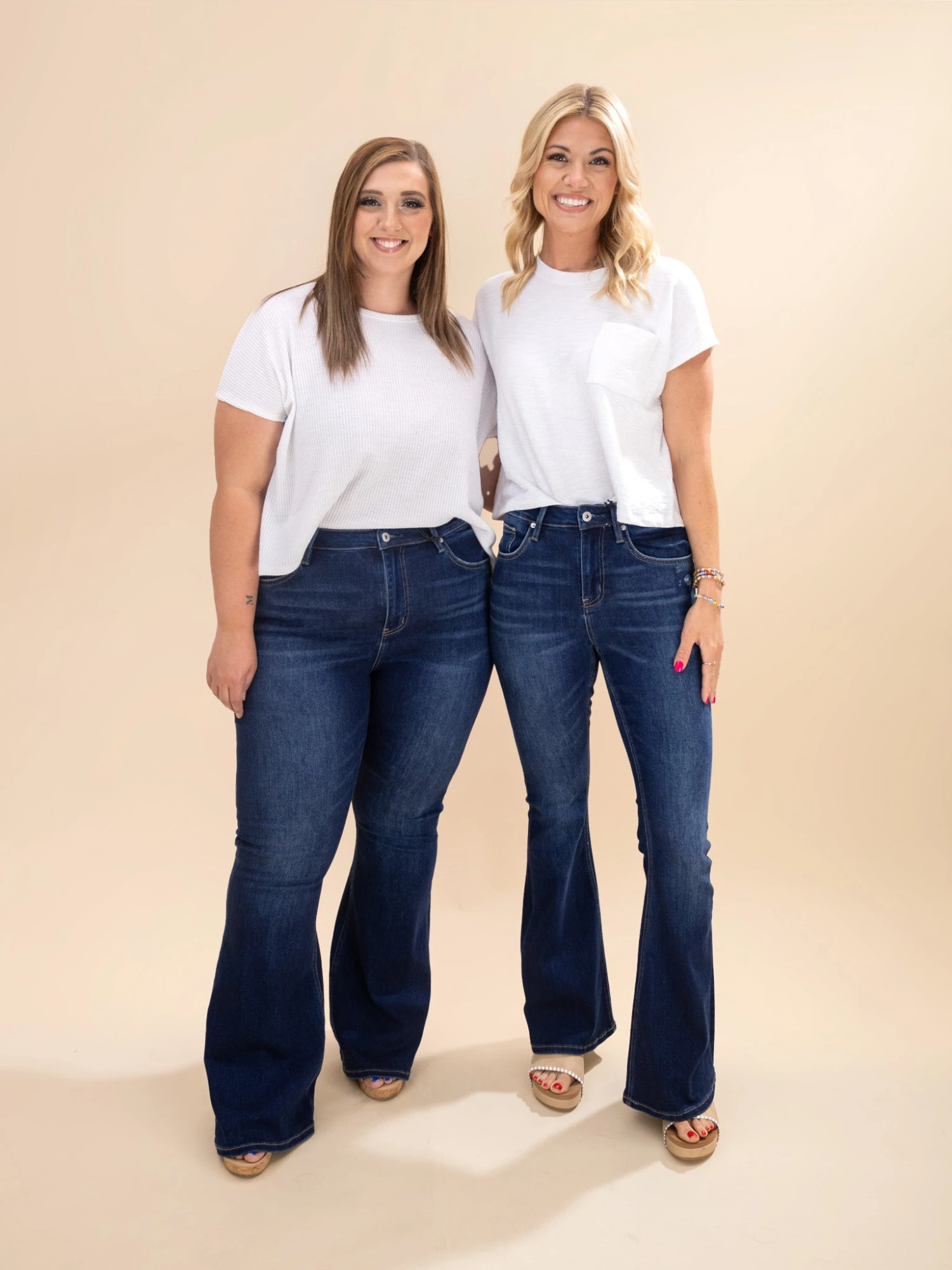 Features: Button/Zipper Waist, Super High Rise, Slight Distressing On Pockets, Flare Leg, Dark Denim