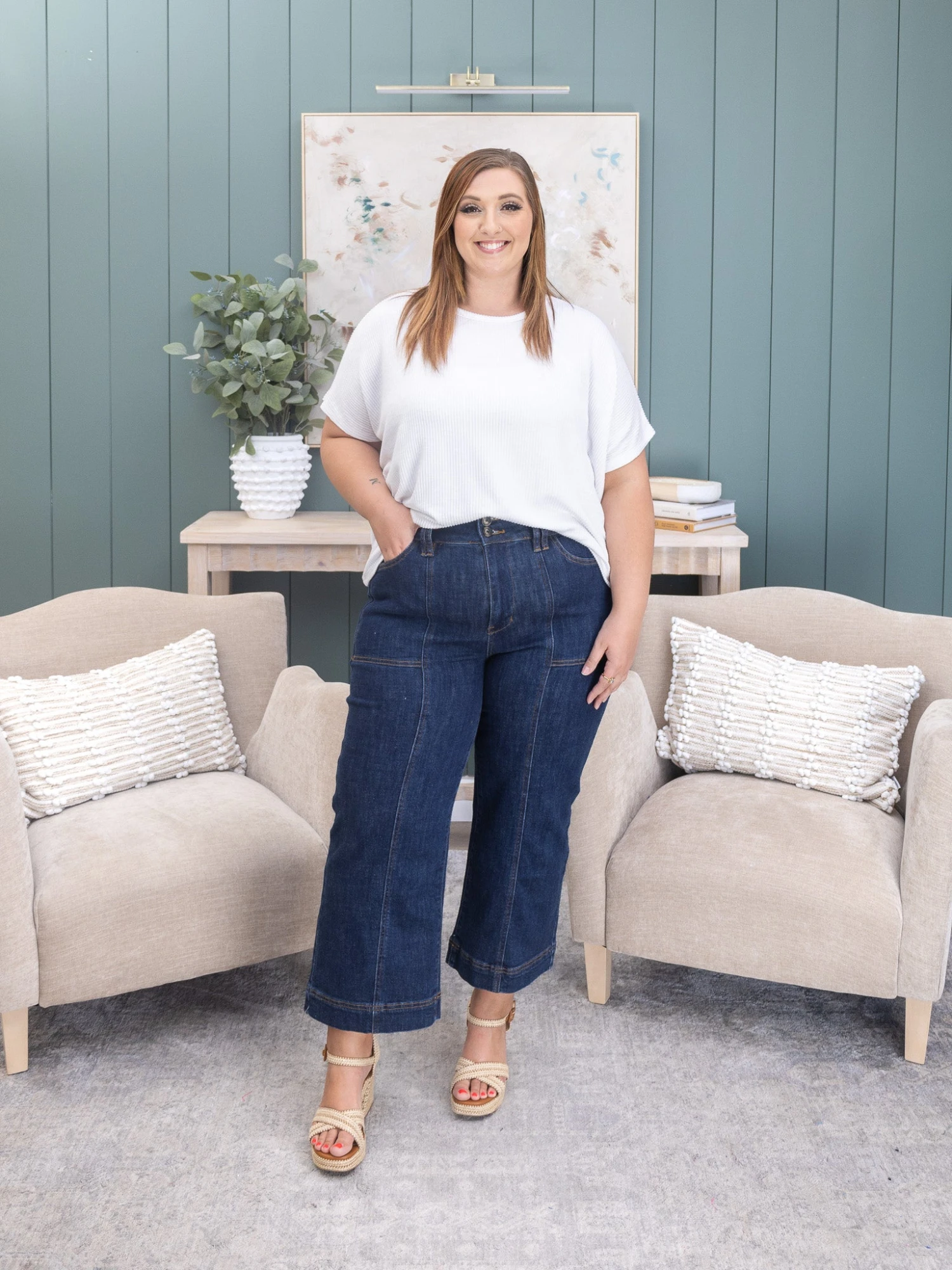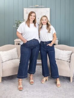 Features: 2 Button / Zipper Fly,Super High Rise, Patch Pockets, Center Seam, Cropped Wide Leg