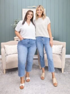 Erin is 5’8, 36C bra, typically wears size L/XL in tops and 14/15 in denim. Wearing size 15